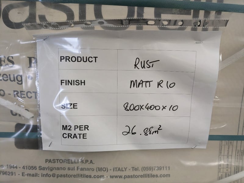 Rust by pastorelli, matt finish tiles.Dimensions: 80x40x1cmM2 per crate: 26.88m2Bid per pallet.Note: signs of wear.