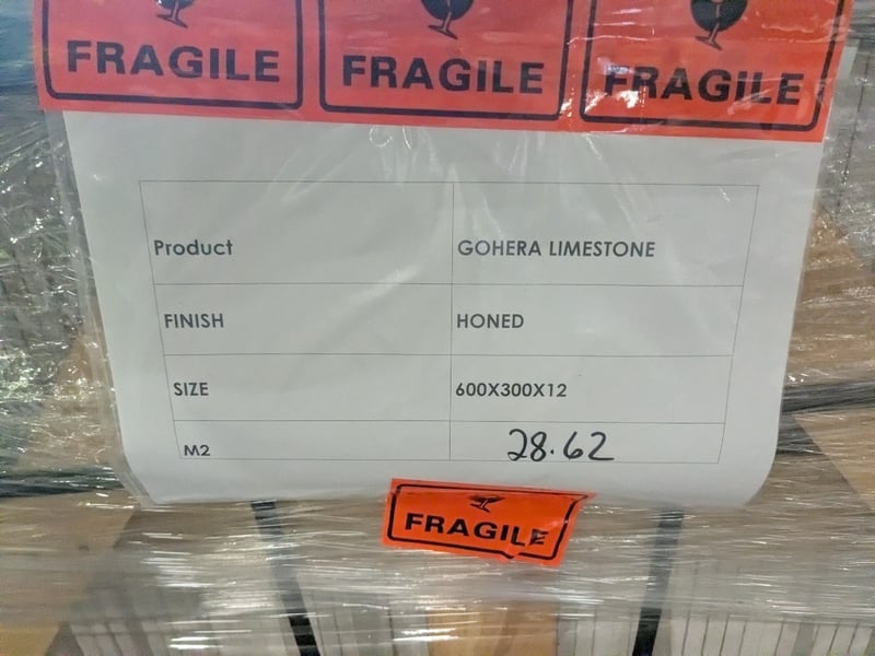 Gohera, Honed finish tiles. Dimensions: 60x30x1.2cm M2 per crate: 28.62m2 Bid per pallet. Note: signs of wear.