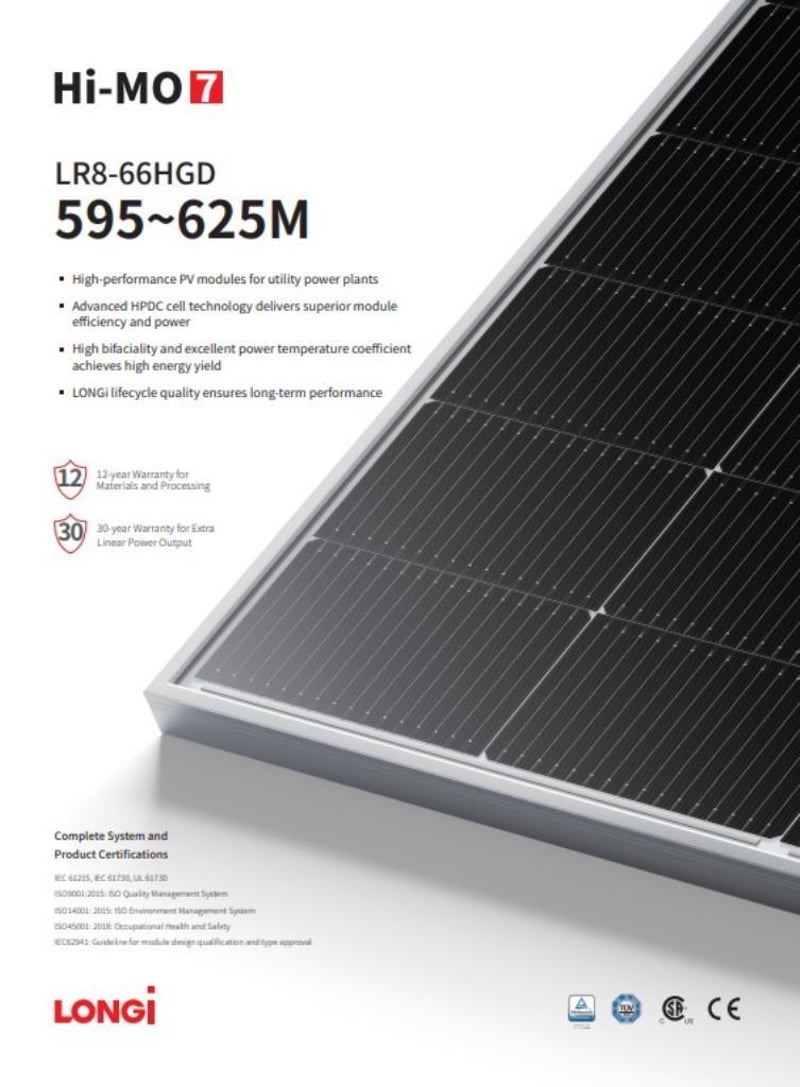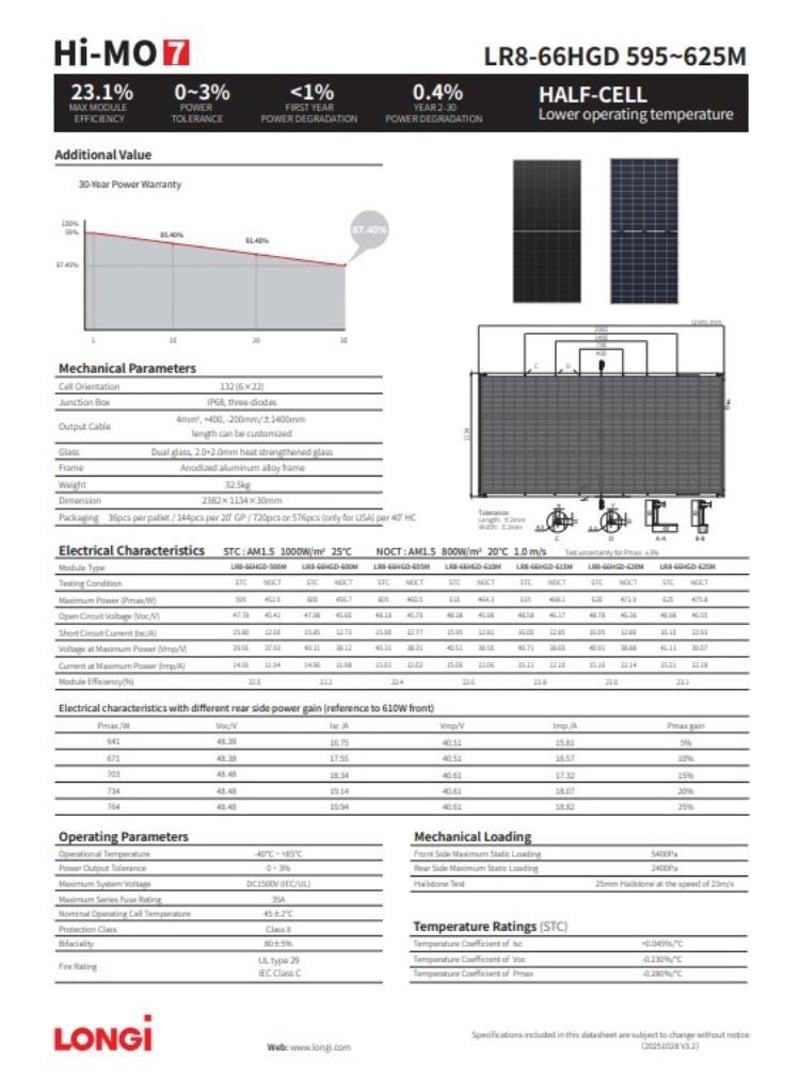 Power Range 595 Wp- 625 Wp, Bi Facial technology, cell number 132 - refer to photos for further specifications