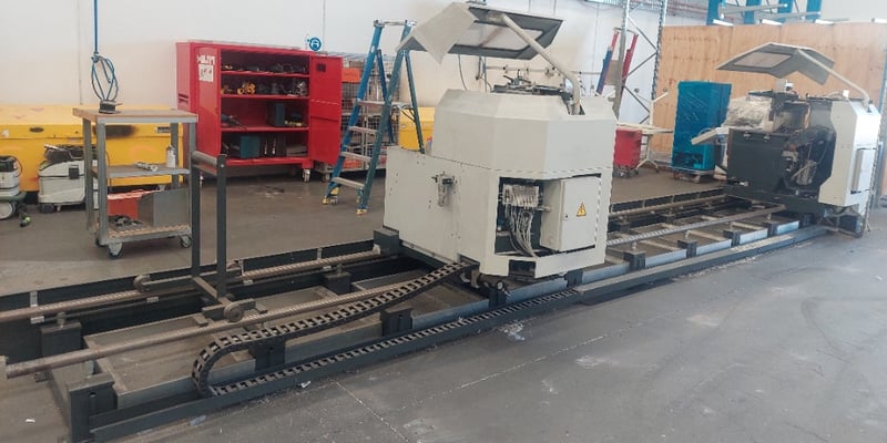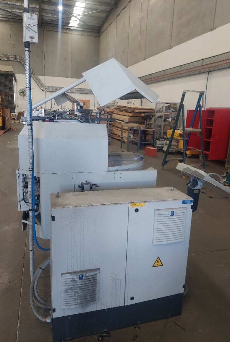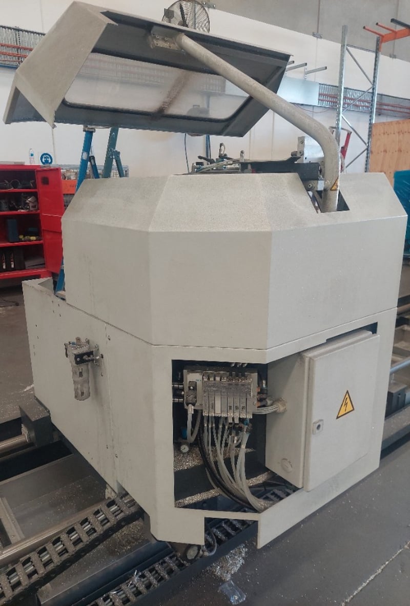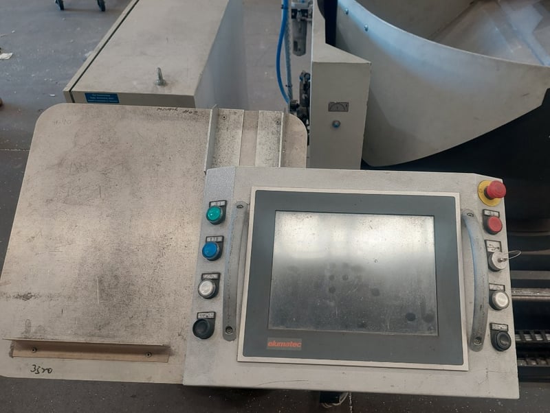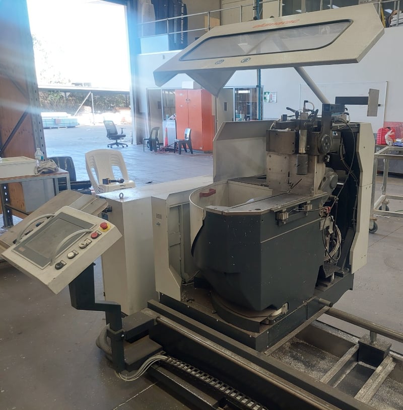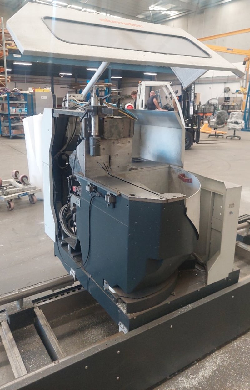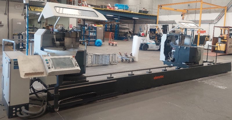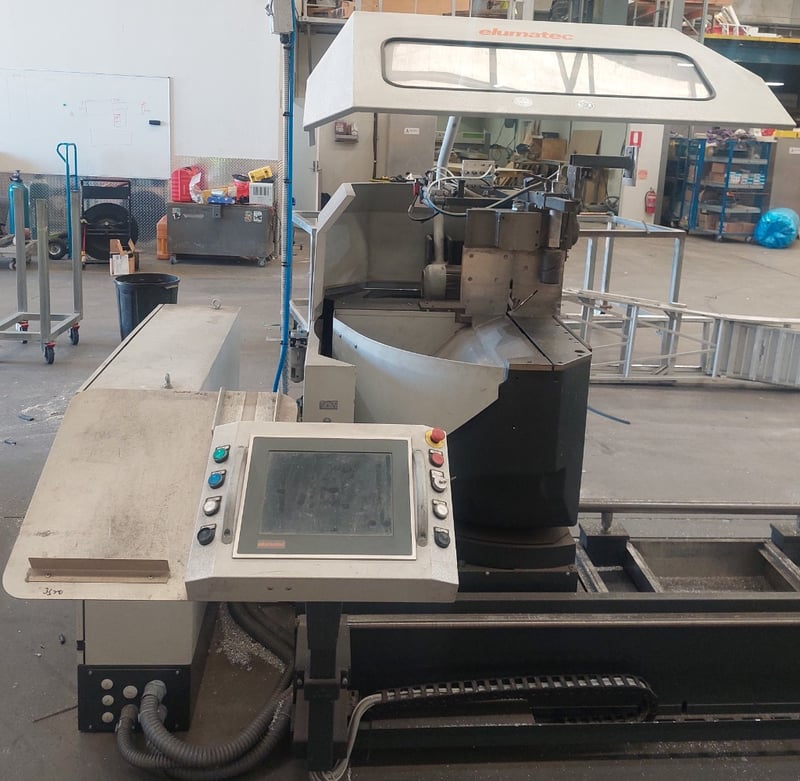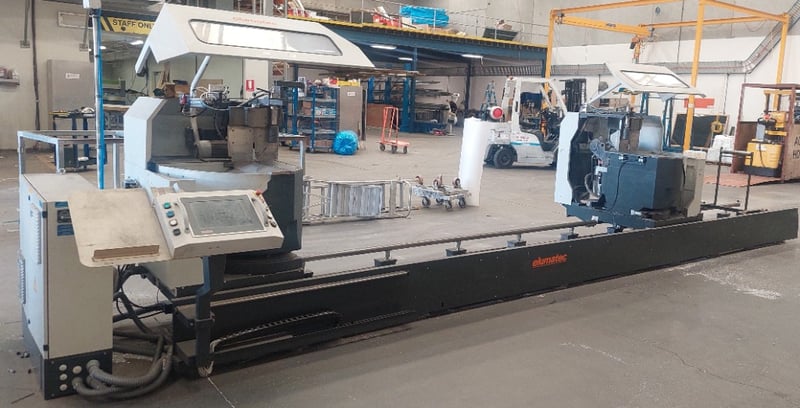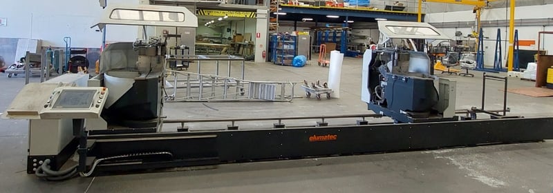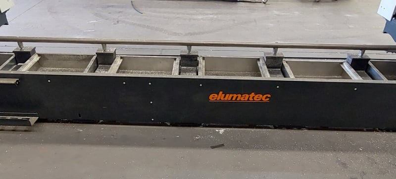 Elumatec DG 244 E680/5 industrial aluminium double mitre cutting saw system. German-manufactured precision machine featuring CNC control with touchscreen interface. Horizontal band saw mounted on sturdy black steel base frame with integrated conveyor system. Equipped with control panel featuring multiple operational buttons and emergency stop mechanism. Machine.Dimensions: 180cm W, 200cm H, 850cm LNote: item is untested, signs of wear.