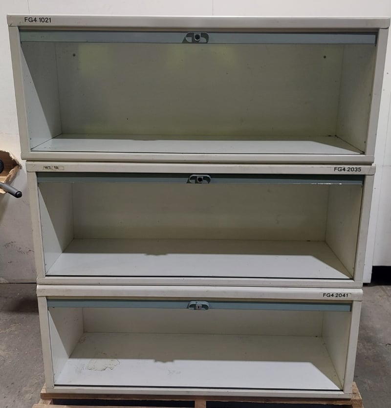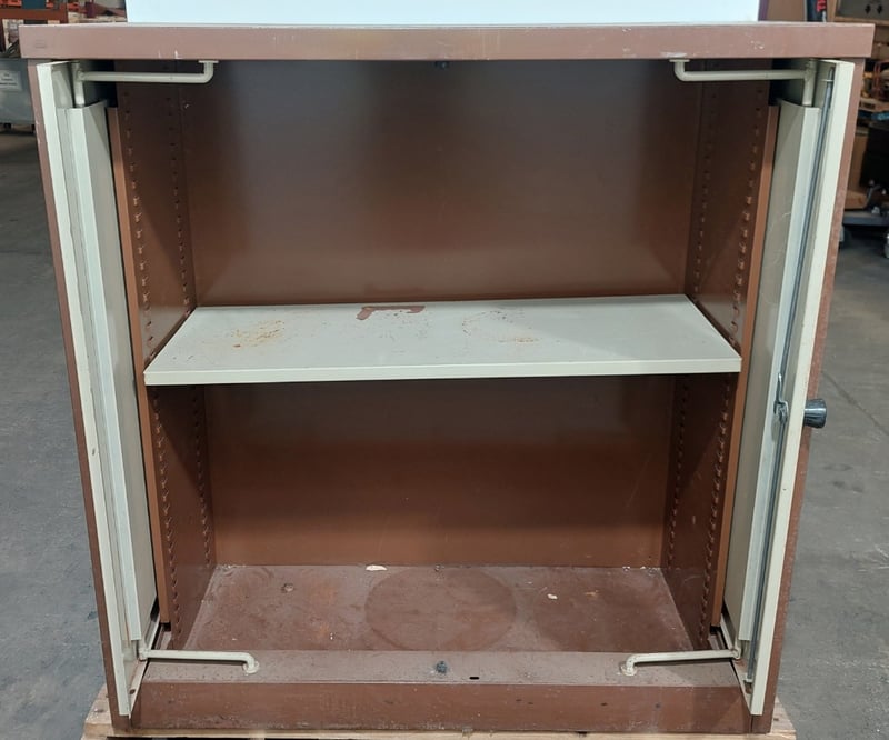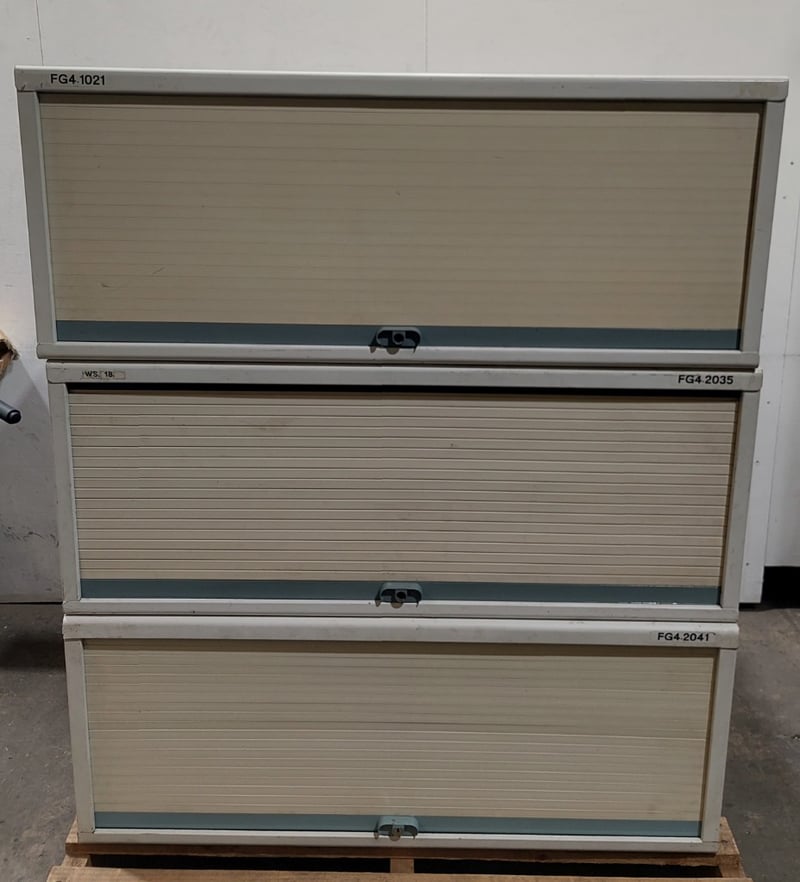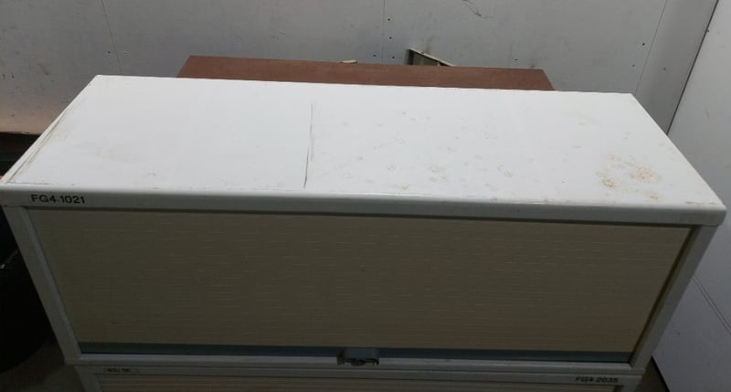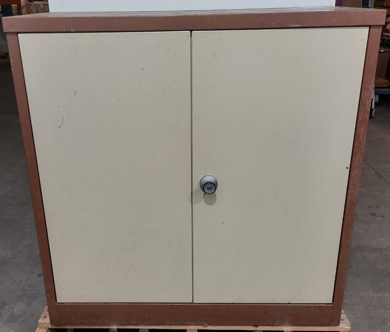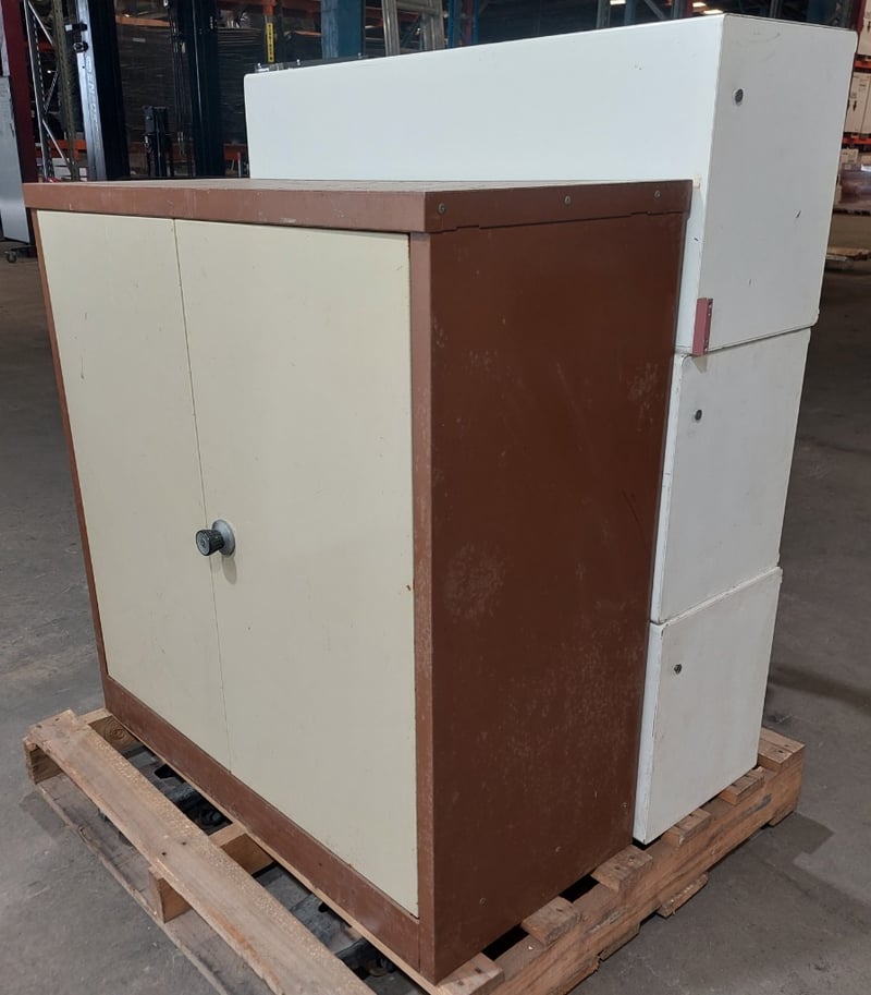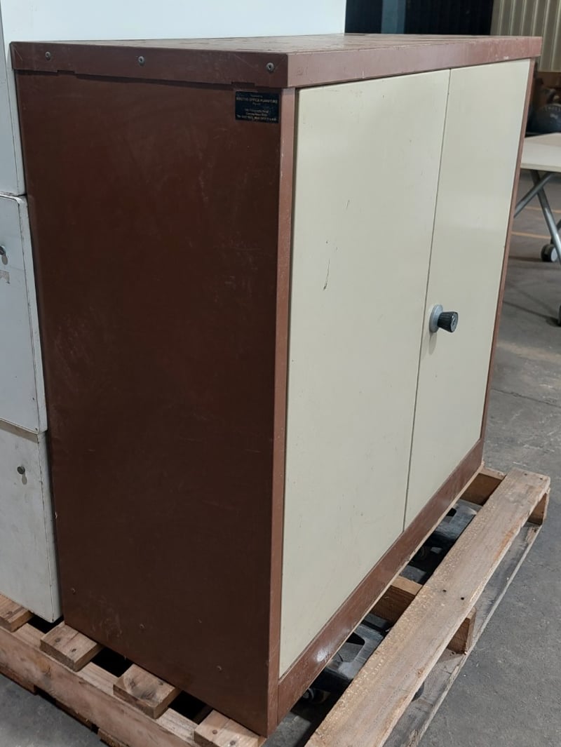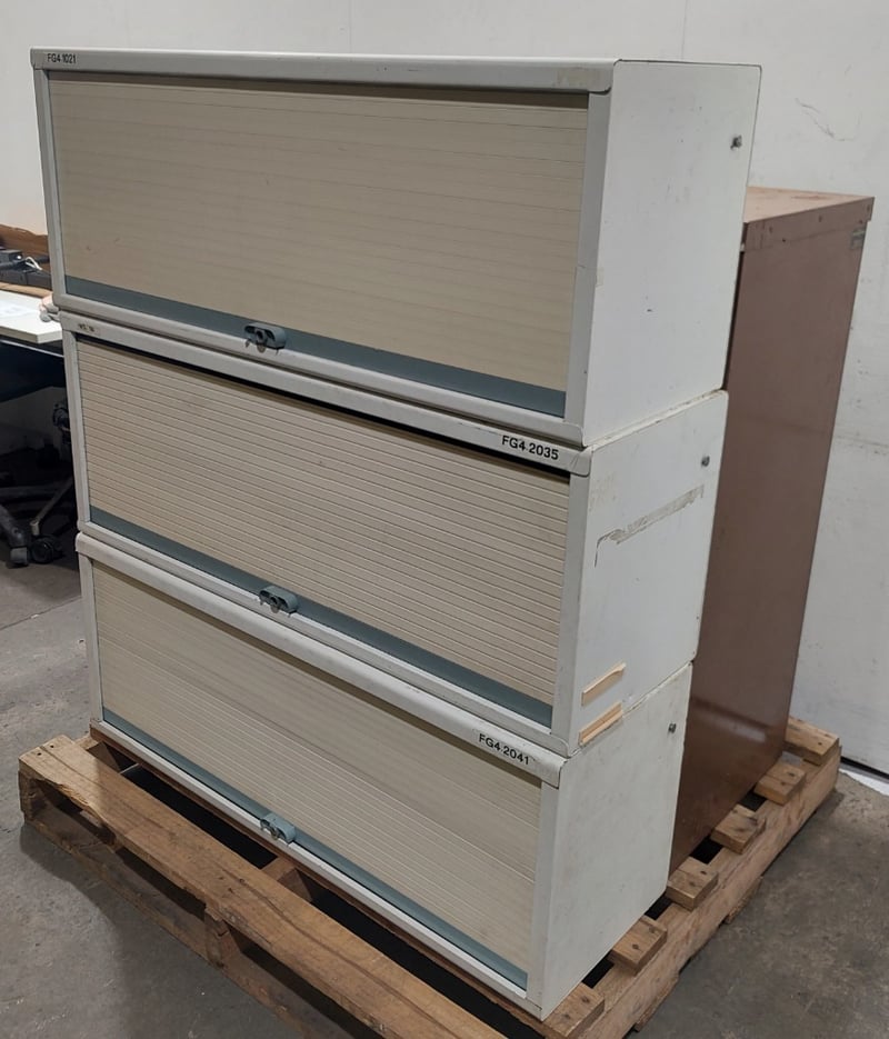 Assorted lot of Metal-like storage cabinets, Dims: Brown 107cm H, 48cm W, 105 D Dims: White 42cm H, 36cm W, 108cm D Sold as a lot. Note: Signs of wear.