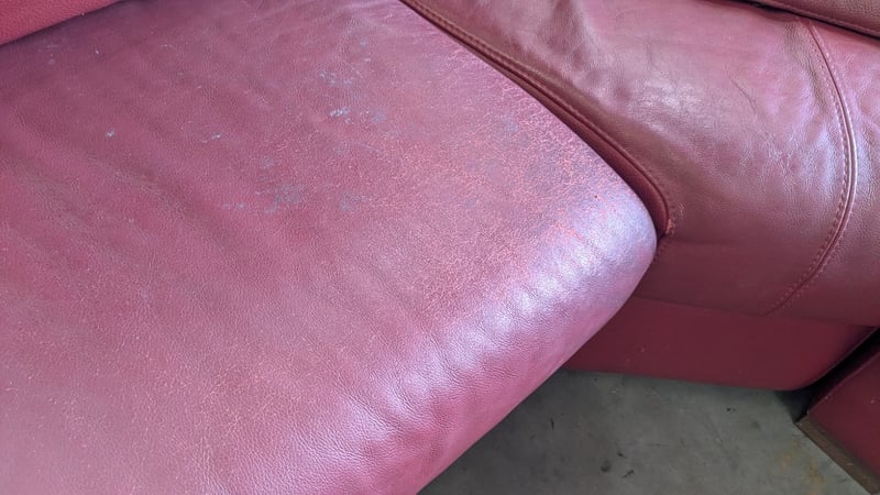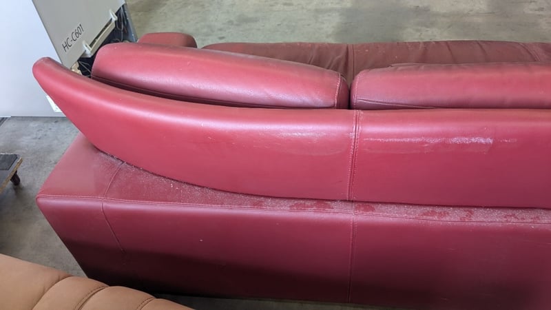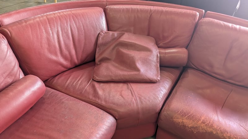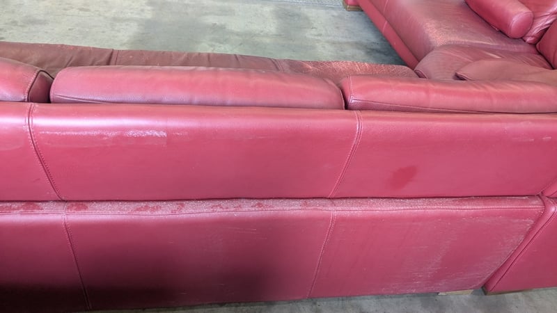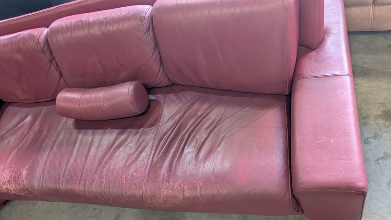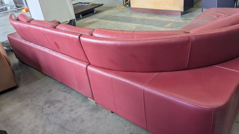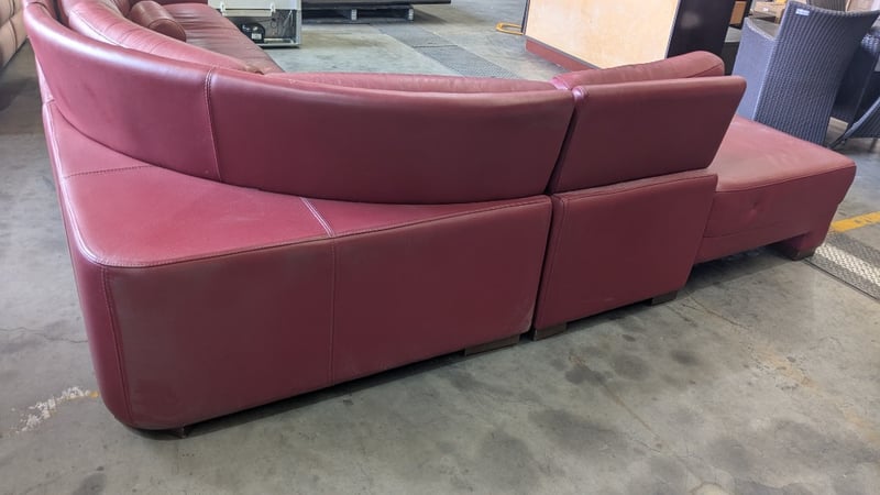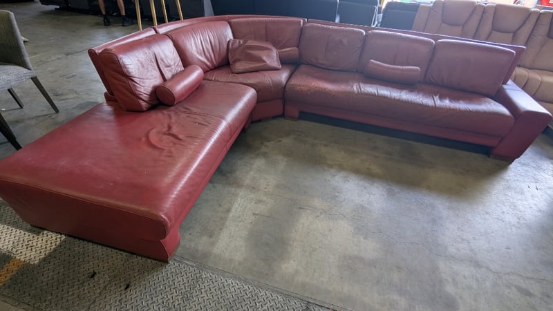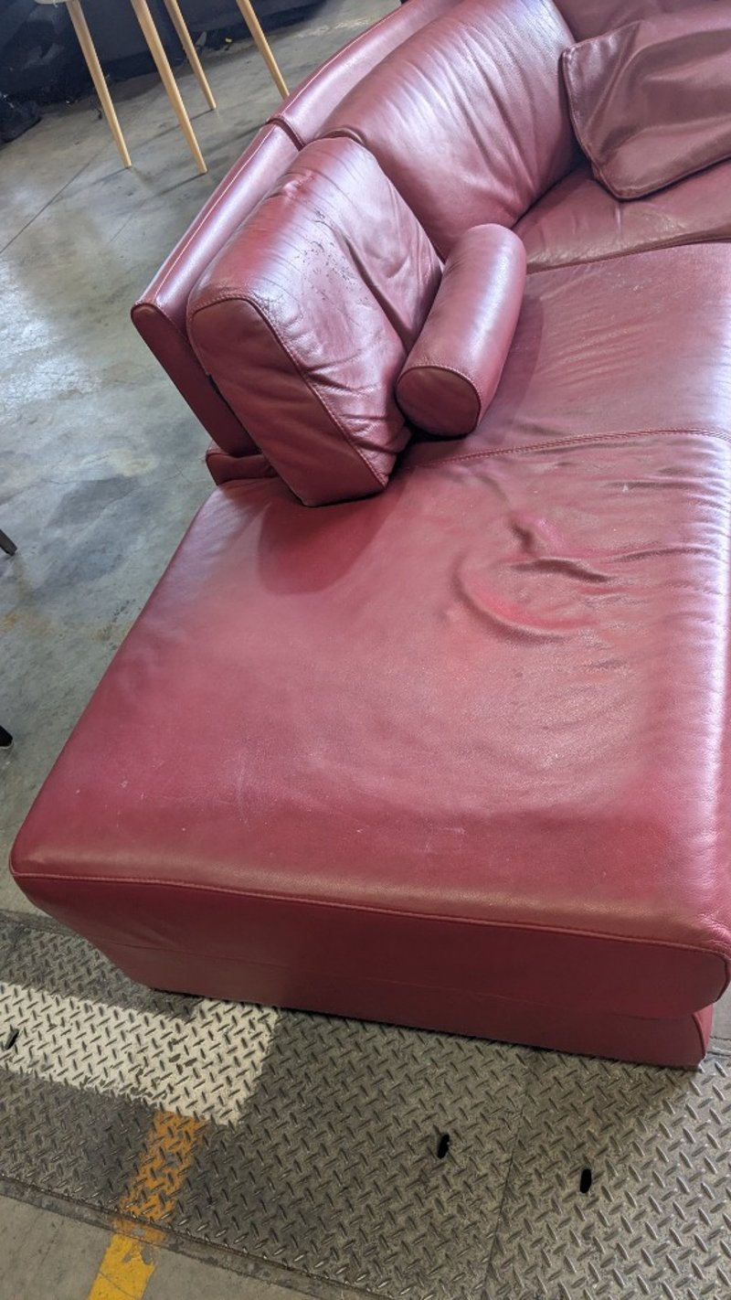 5 Seater Lounge, Red Leather, 3 Piece with Cushions, Timber Legs Dimensions: 3330mm(W) x 2710mm (D) x 820mm(H) NOTES: HEAVILY SCUFFED, INSPECTIONS HIGHLY RECOMMENDED