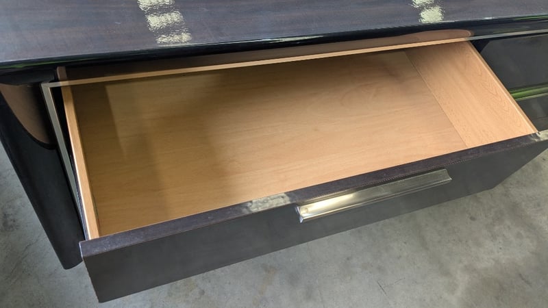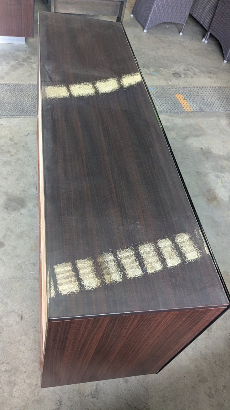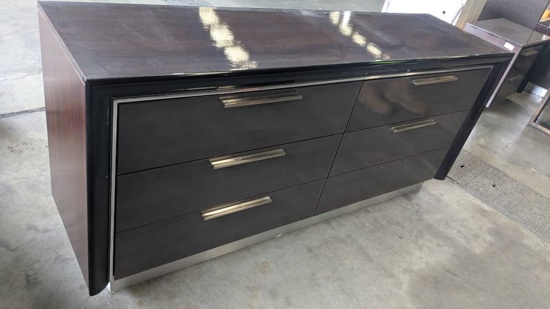 Timber Laminate Dresser, 6 Drawer, Brown, Bronze HandlesDimensions: 1740mm(W) x 480mm(D) x 800mm(H) NOTE: INSPECTIONS HIGHLY RECOMMENDED