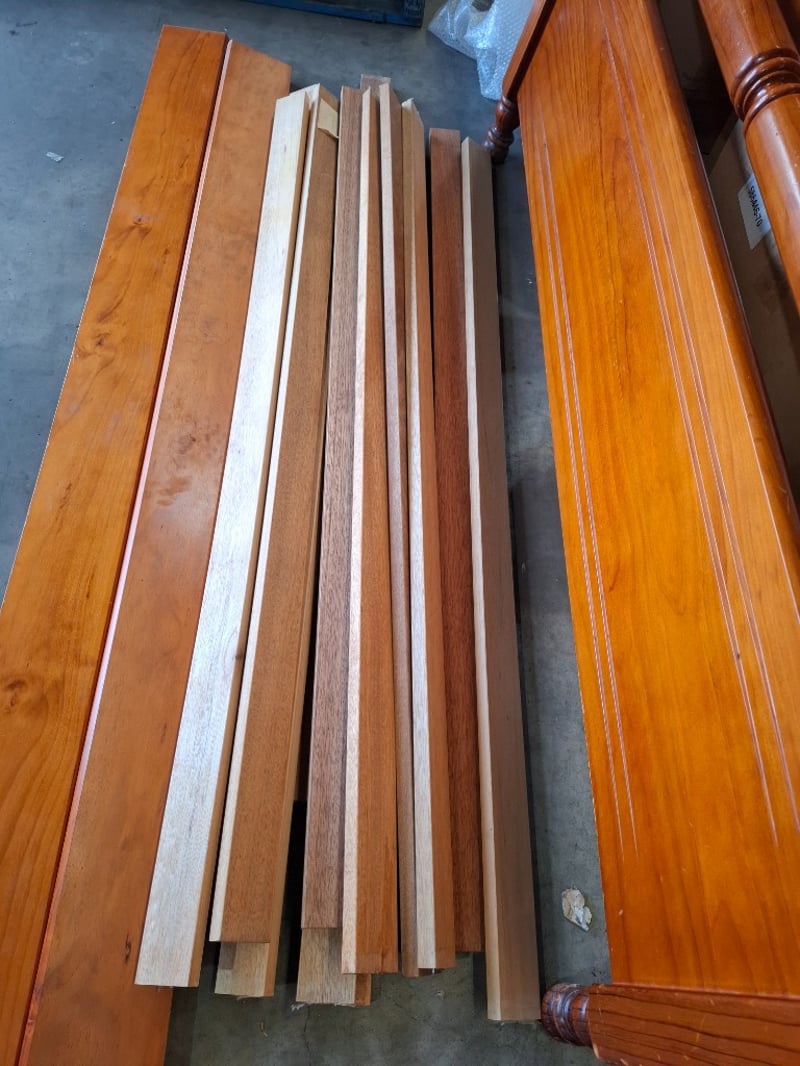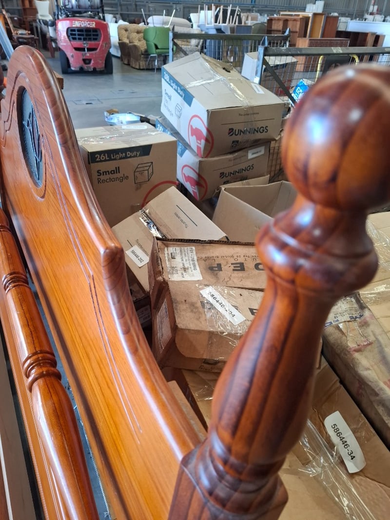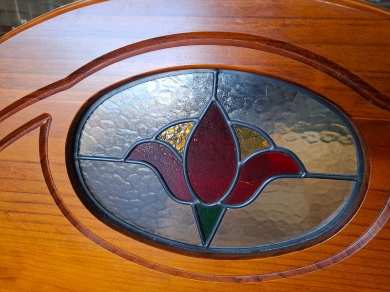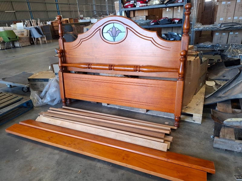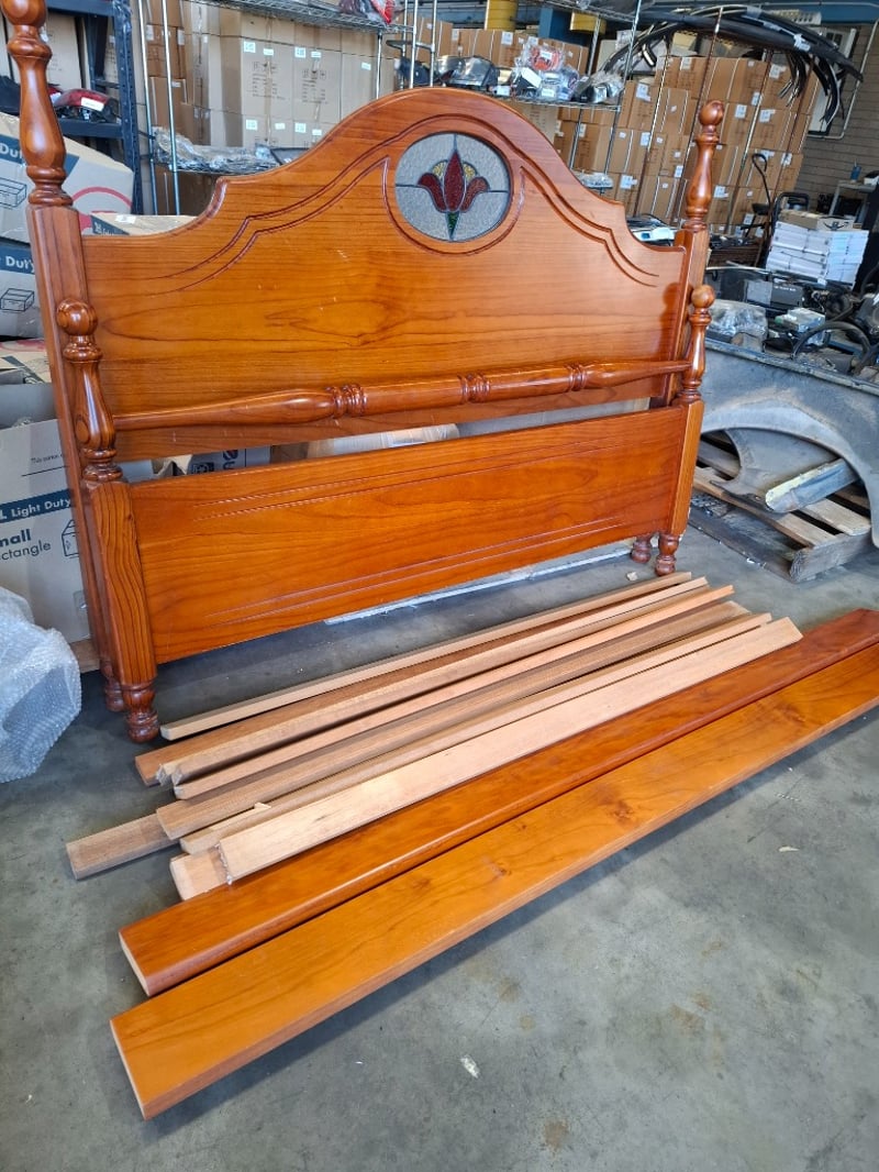 1x Queen bed frame with headboard featuring stained glassNote: minor cleaning required, wear and tear