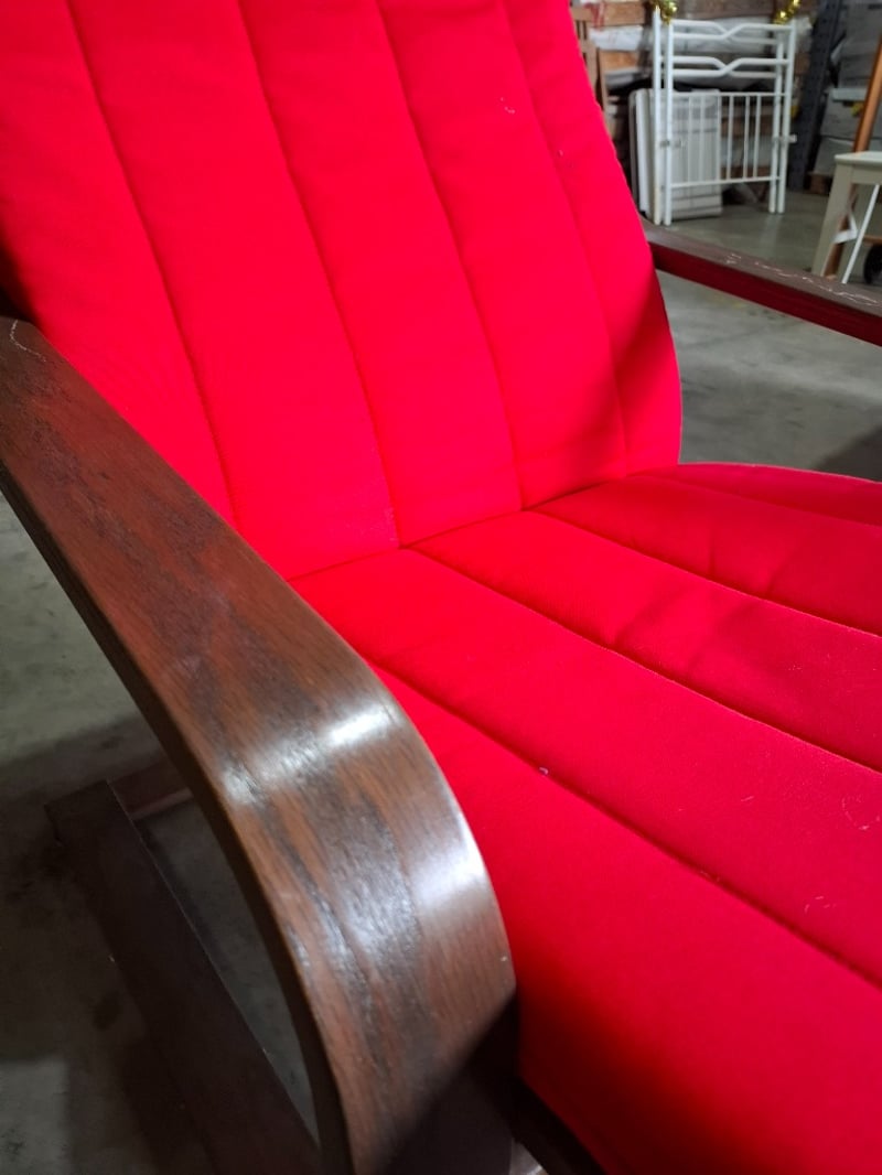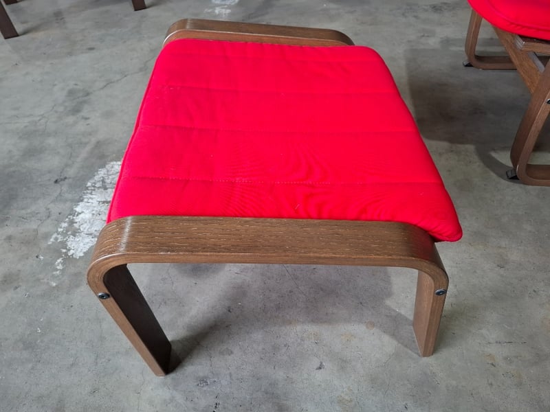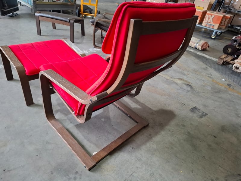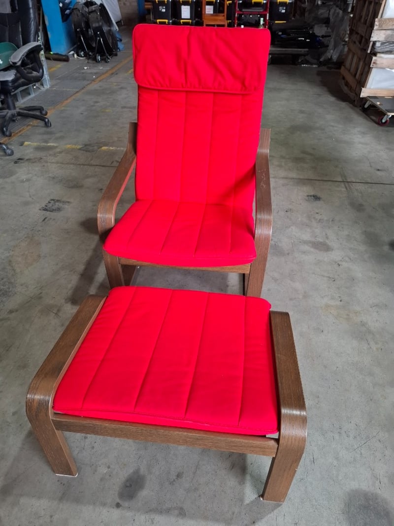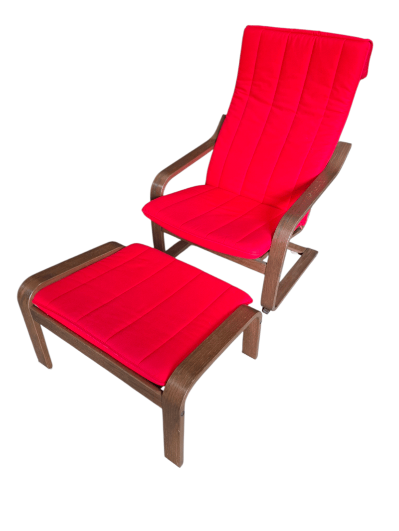 Ikea Poang Chair Armchair and Footstool Set with red fabric CoversDimensions: 68-69cm (W) x 97-39 cm( H) x 70-54cm (D)Note: wear and tear, minor cleaning required