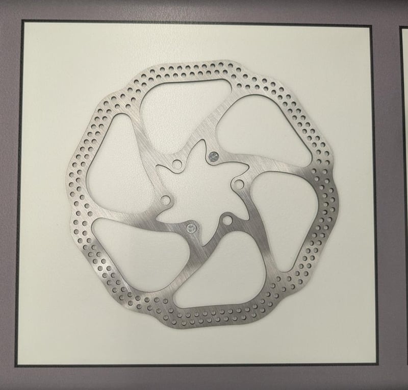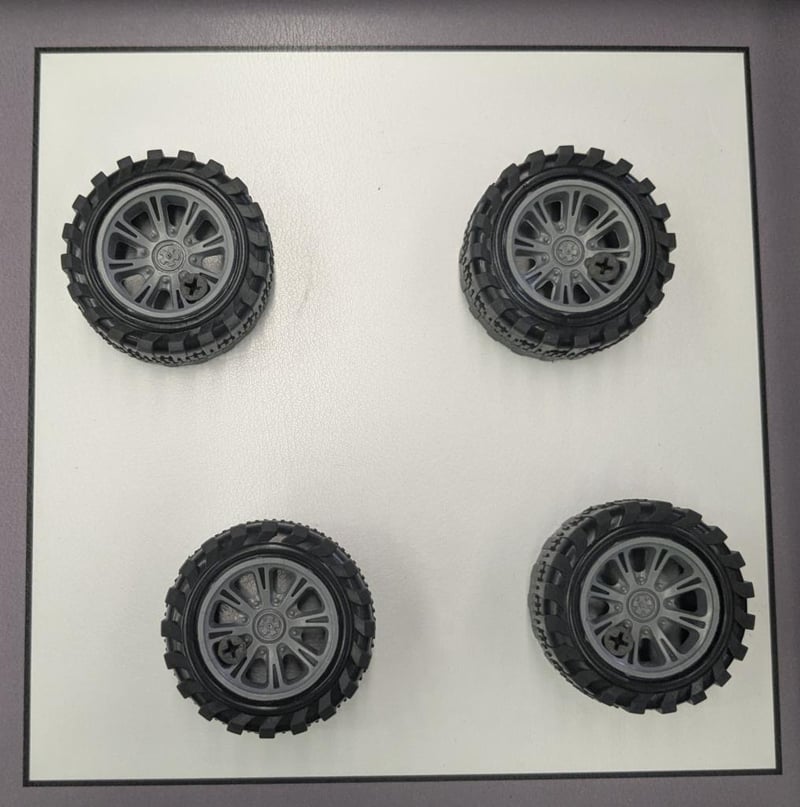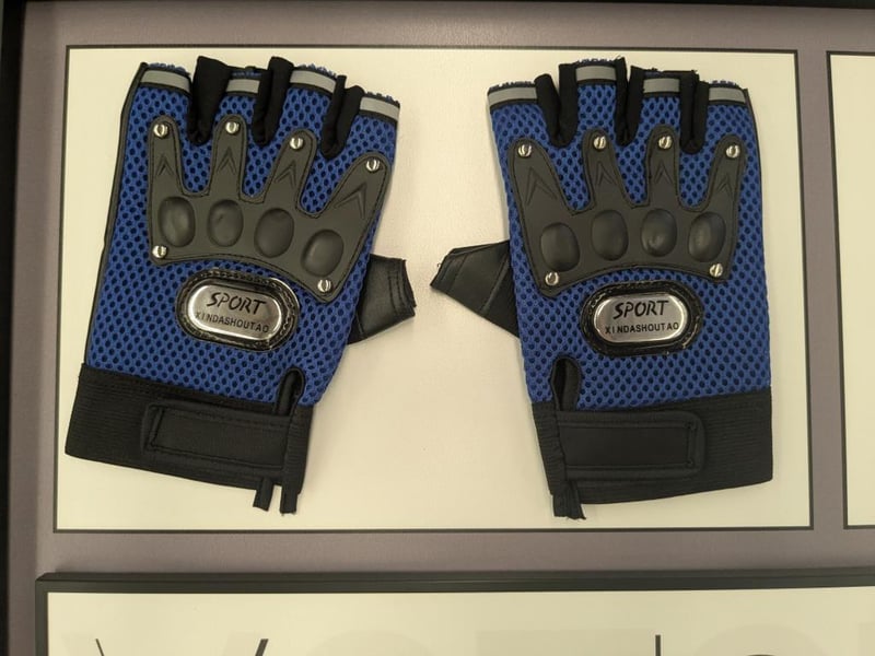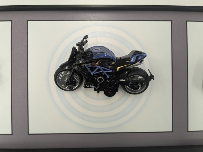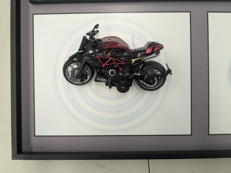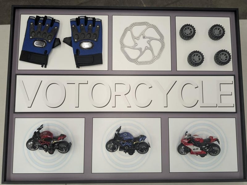 Decorative shadow box display featuring motorcycle-themed collectibles, including toy diecast models, gloves, a brake disc, and tires.