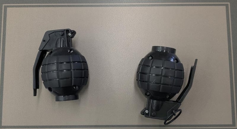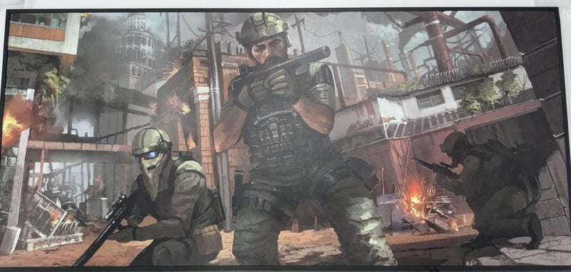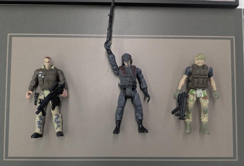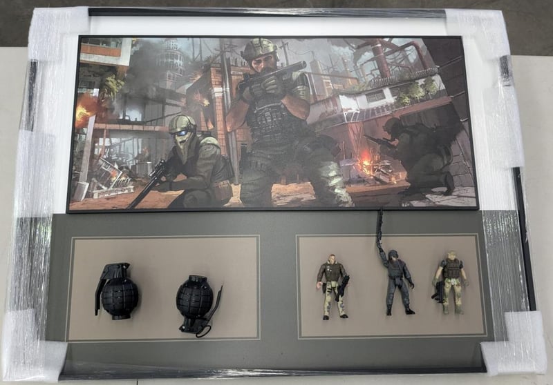 Decorative shadow box display featuring military-themed collectibles, featuring tactical artwork, action figures, and toy grenades.