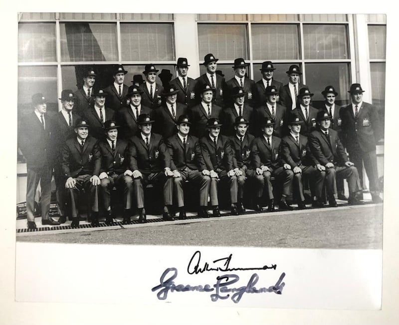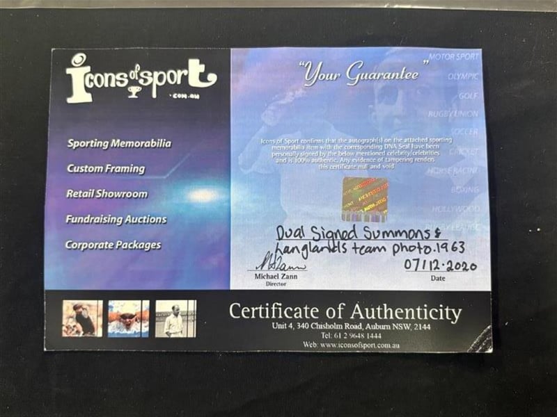 DUAL SIGNED SUMMONS AND LANGLANDS 10 X 8 1963 TEAM PHOTO. UNFRAMED Hand signed 10x8 photo of the 1963 Australian Rugby League Team that secured victory in Europe against France and England for the first time since 1908. Hand signed by the Captain, the late Arthur Summons, and Australian Immortal and team mate Graeme Langlands. Includes COA20cm x 25cm Condition: GOOD - REFER IMAGES