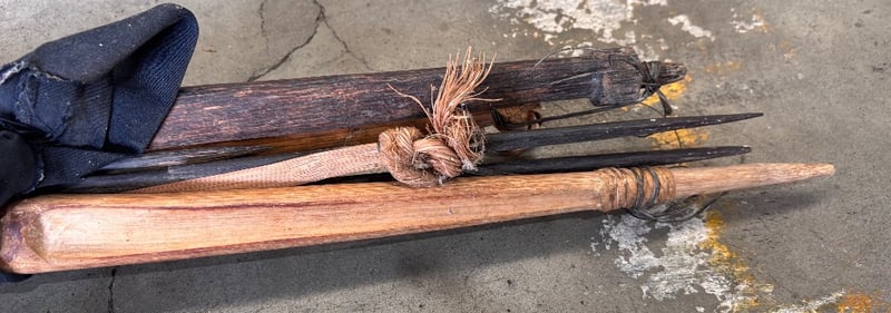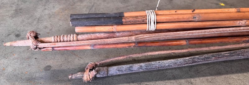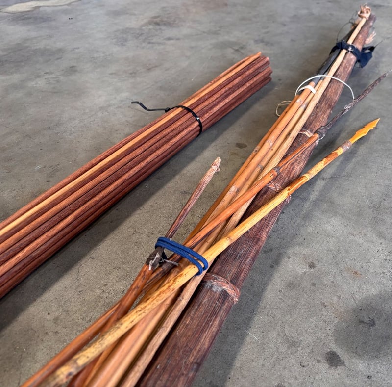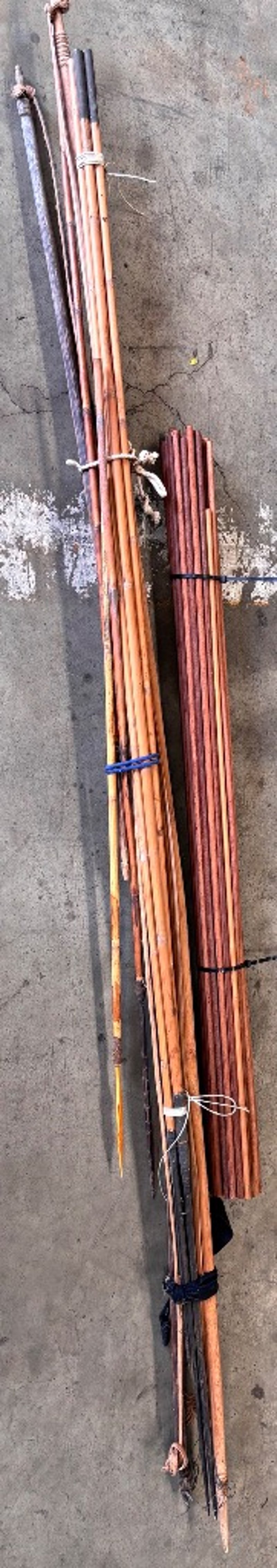 Hand crafted wooden arrows, bows, spears and bulk lot of wooden sticks for arrow making.Note; Sold as lot, some items may have damages (refer to images)