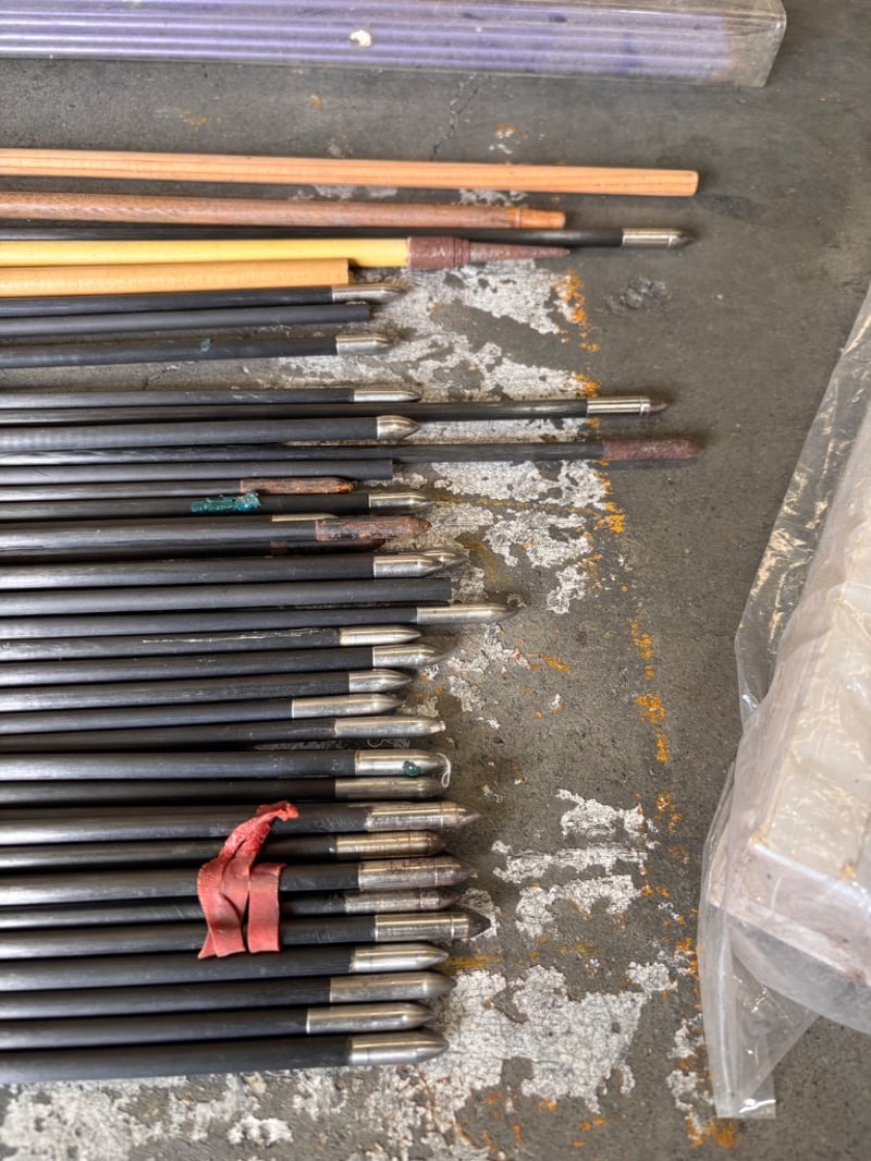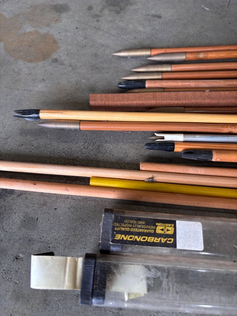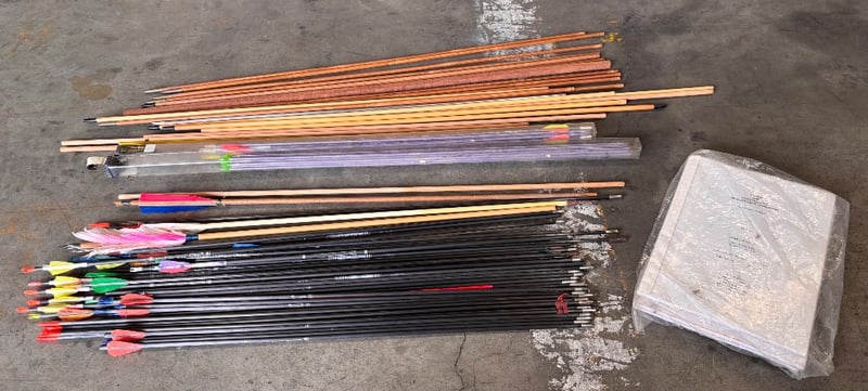 Collection of arrows, booklet on making bows, wooden sticks for arrow making, Bohning archery nockNote; Sold as lot? Items may be damaged (refer to images)