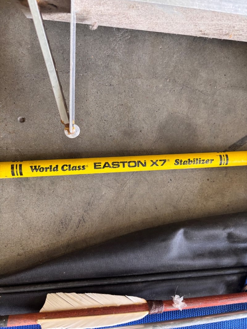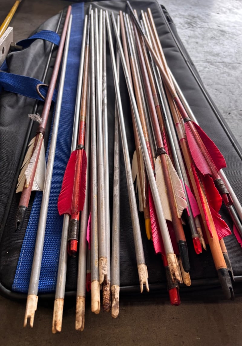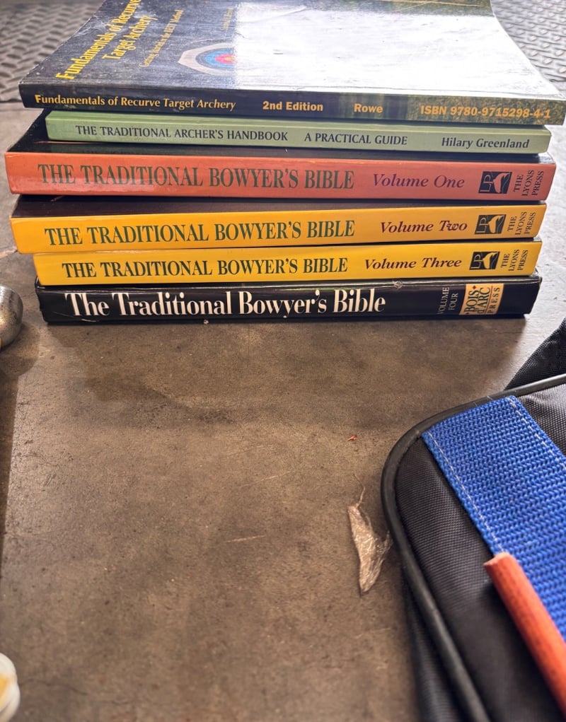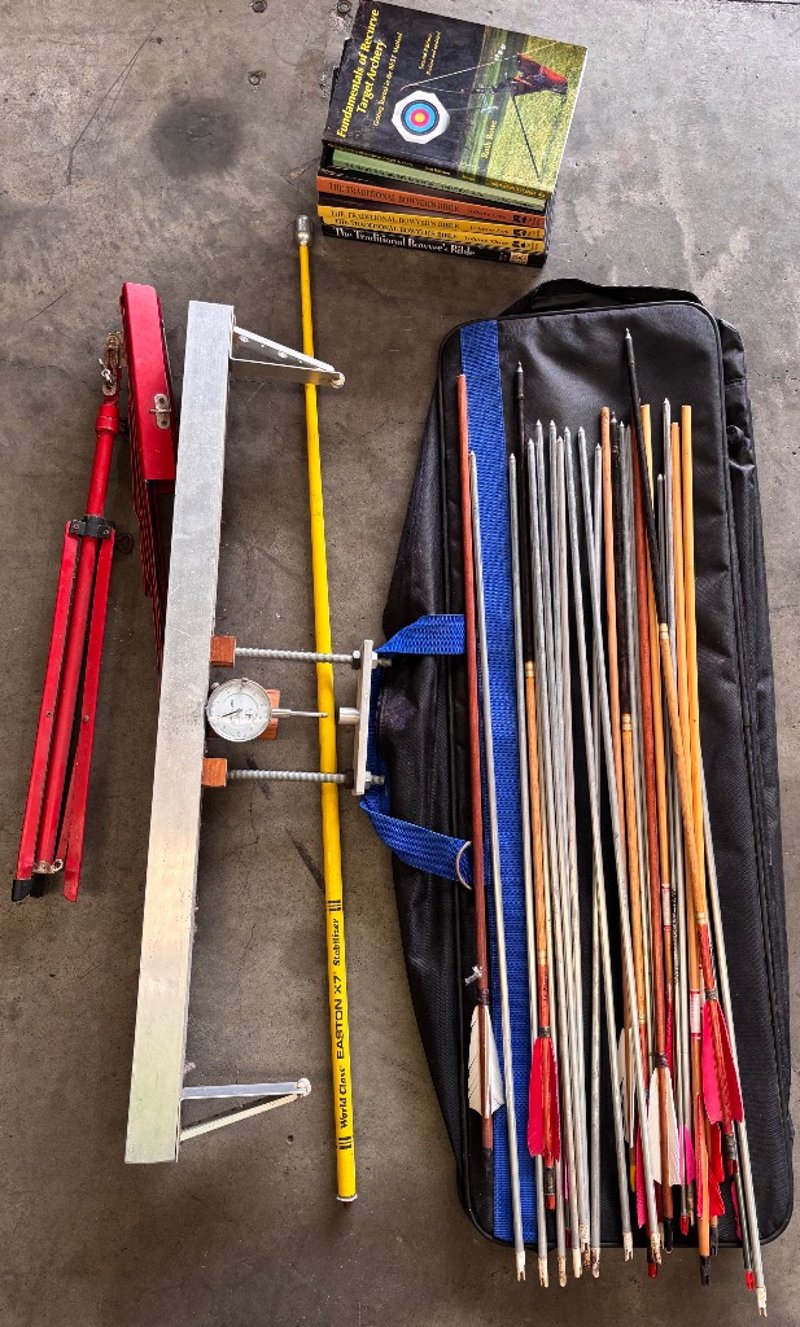 Assortment of arrows, arrow spine tester, books about bowsNote; Sold as lot, items may have damages(refer to images)