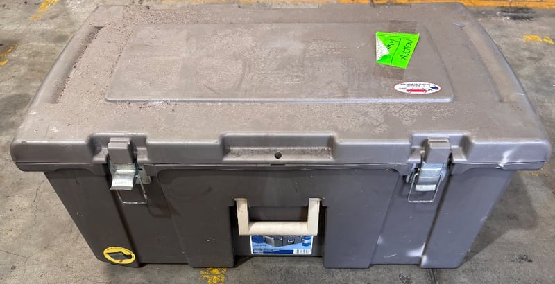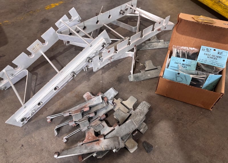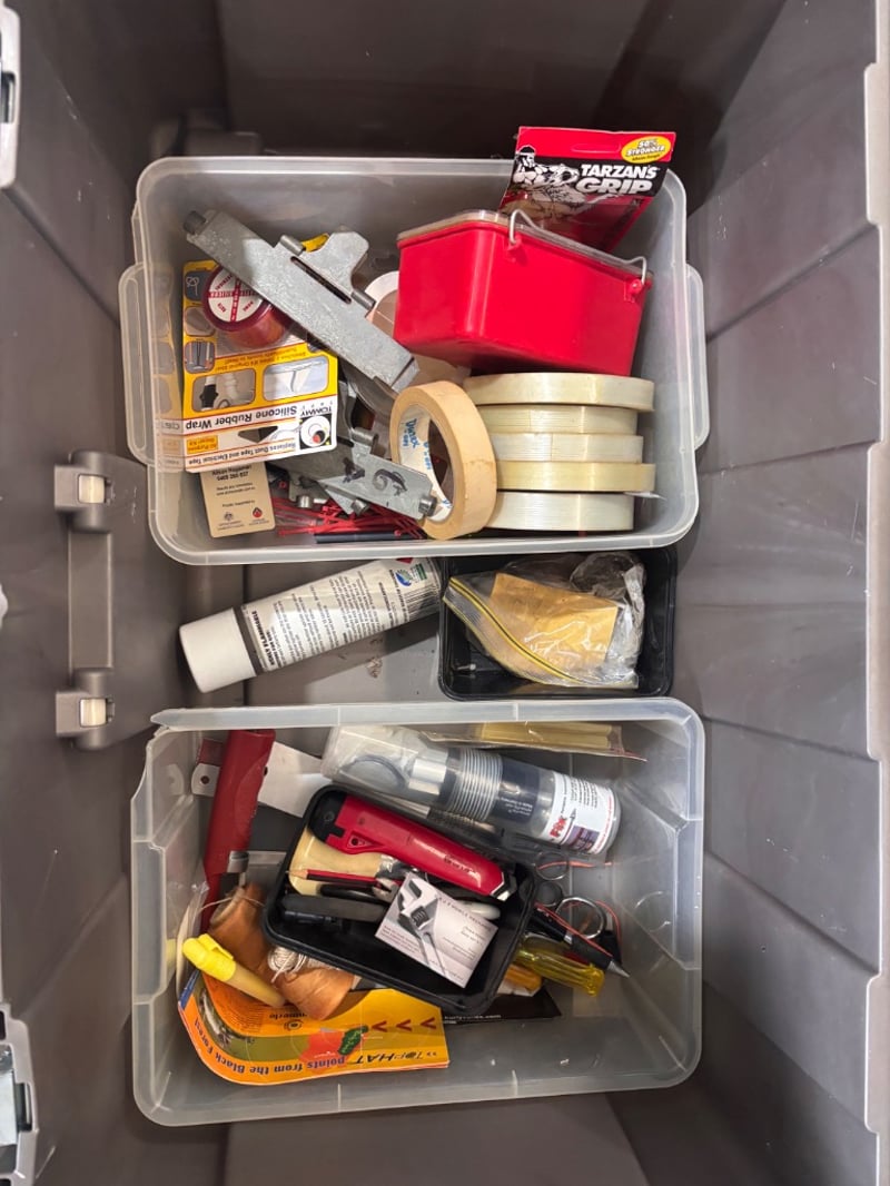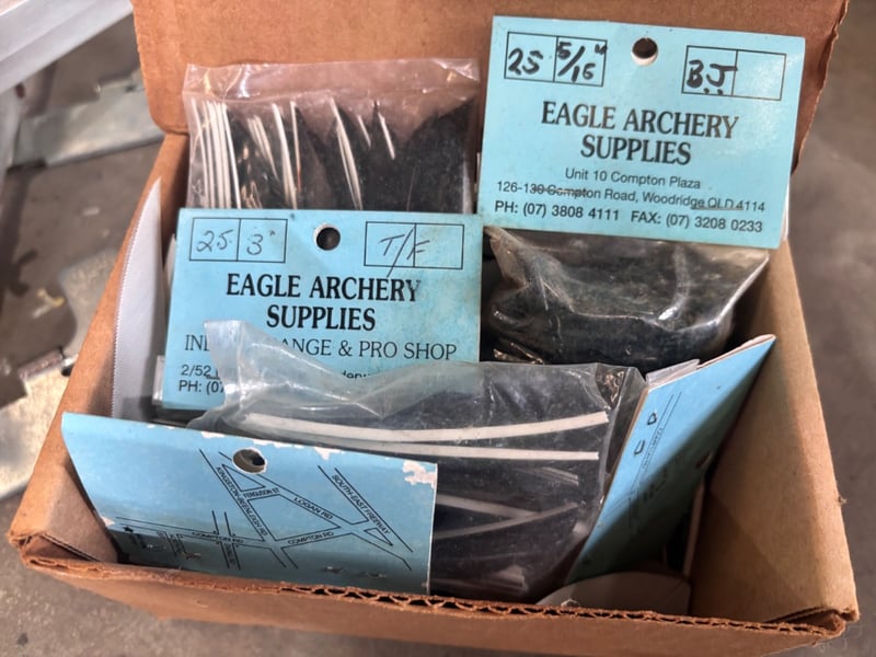 Outside storage box including arrow fletching, metal scraps, various equipment, tapeNote; Sold in lot, items may be damaged (refer to images)
