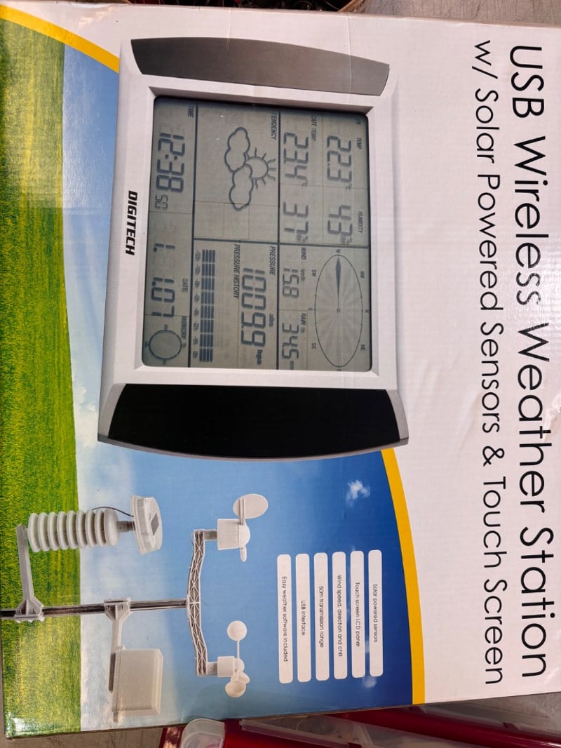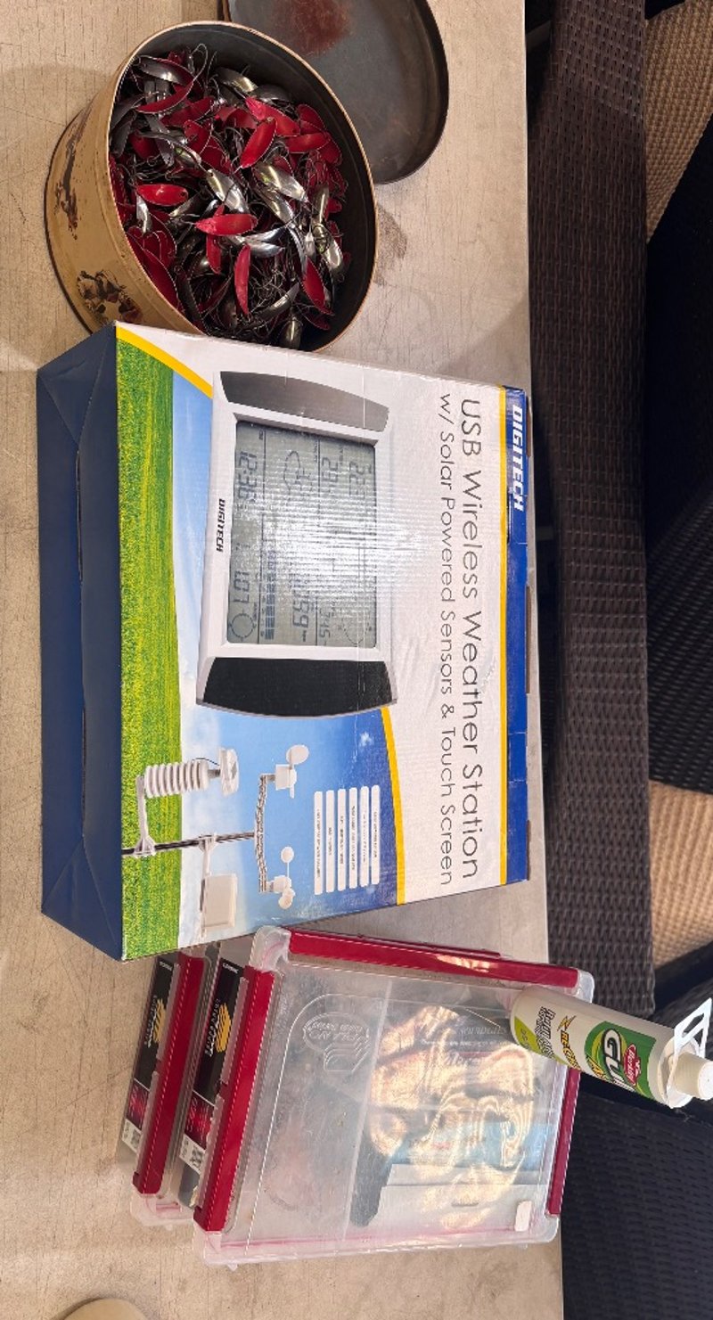 Outdoor accessories including, tackle boxes, hooks, USB wireless weather station, ect.Note; Sold as lot, items may be damaged (refer to images)