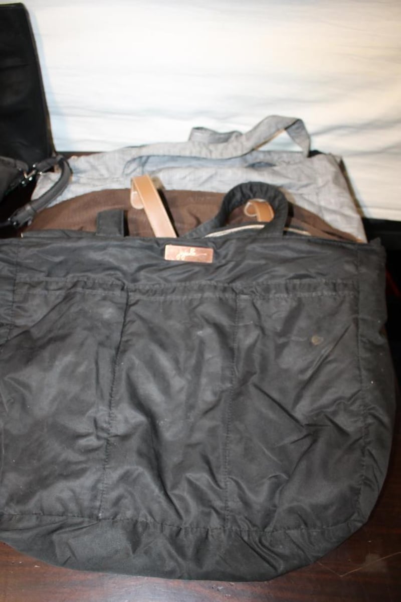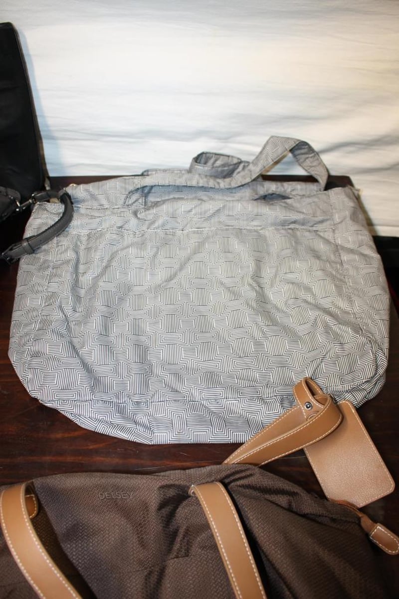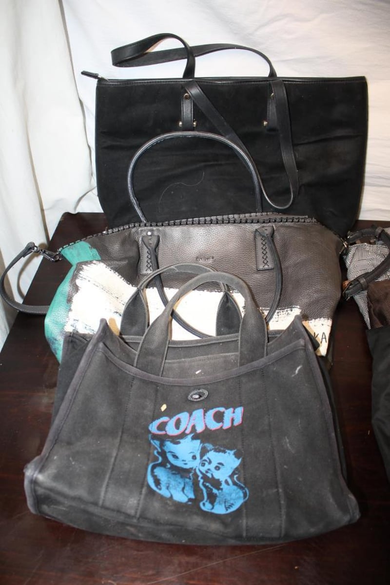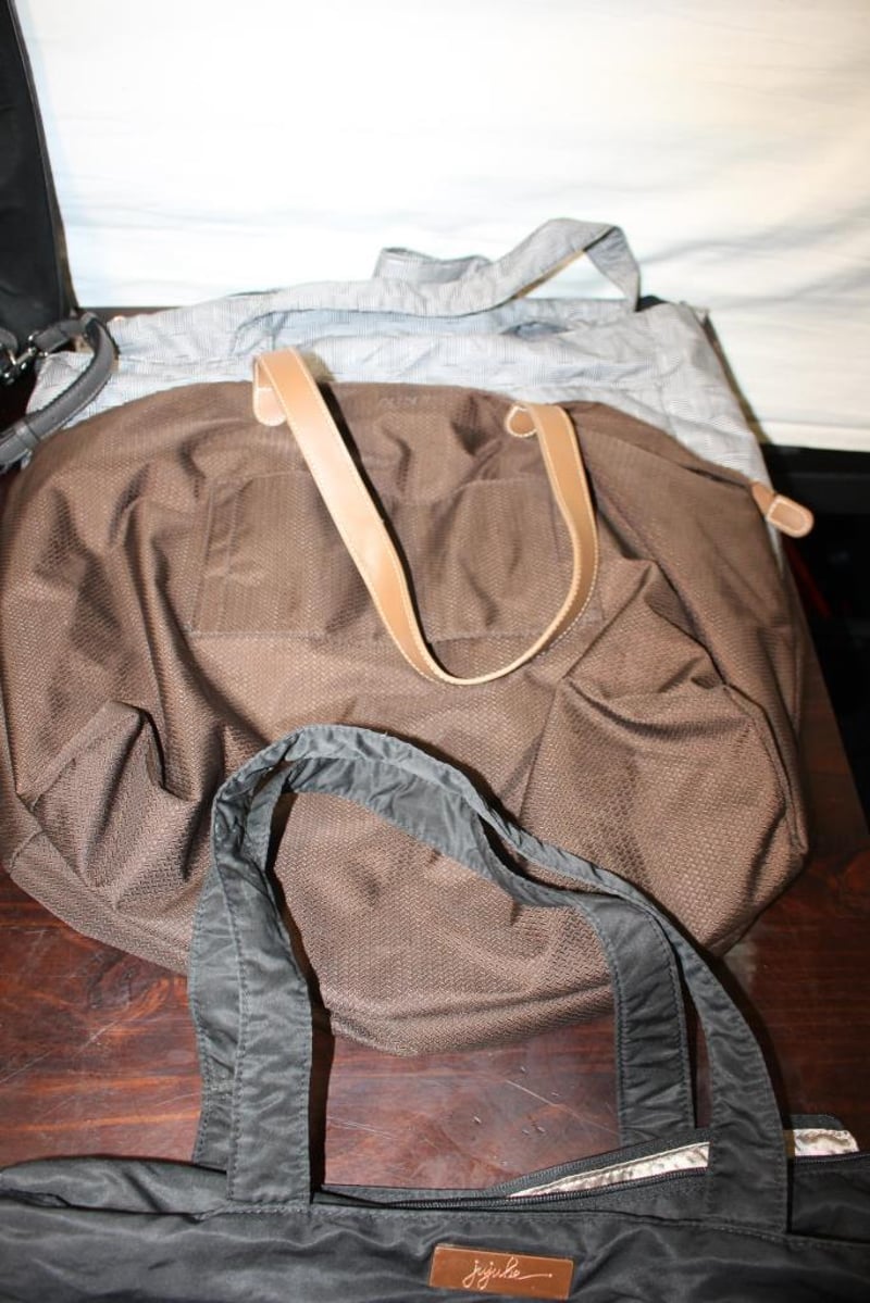 Assorted Handbags & Travel Bags – Mixed Brands (5)Includes Coach canvas tote, large black tote, Ju-Ju-Be style black tote, Delsey brown travel bag and grey patterned travel bag.Pre-owned condition with visible wear, marks and creasing; selling as a mixed lot.