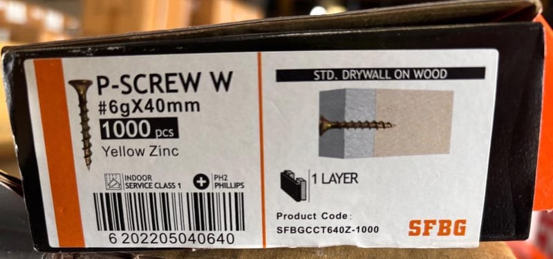 RRP $600 SFBG Screws, P-Screw W Discontinued.. 6g X 40mm Collated Coarse Thread Screws Zinc 1000pcs Qty: 10 boxes of 1000pcs Model No. SFBGCCT640Z-1000 Note: Sold As Lot