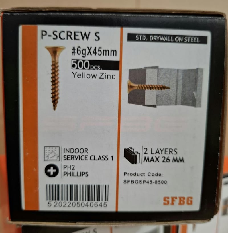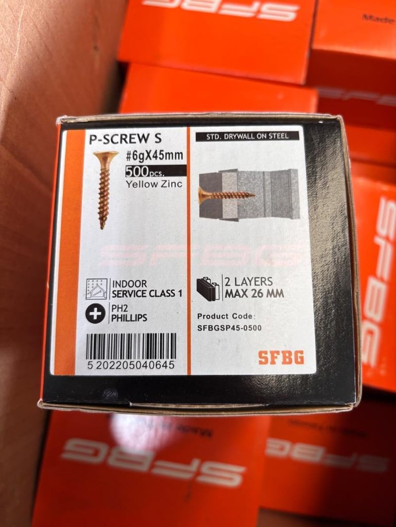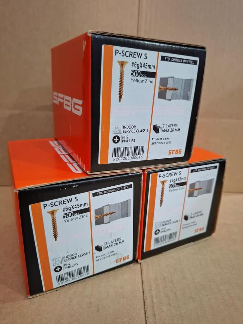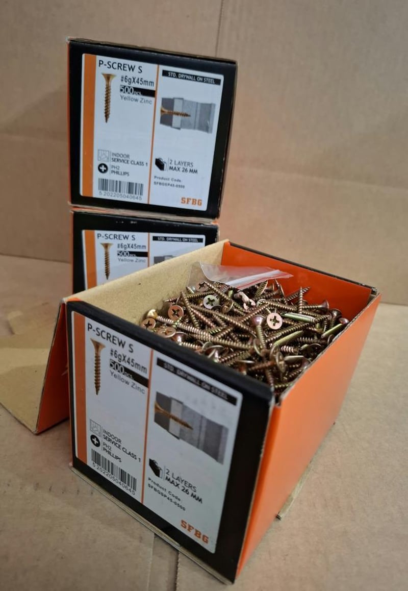RRP $150 SFBG Screws,STD Drywall on steel P-Screw S #6gX45mm, 500pcs. Qty: 3 boxes Note: Sold As Lot