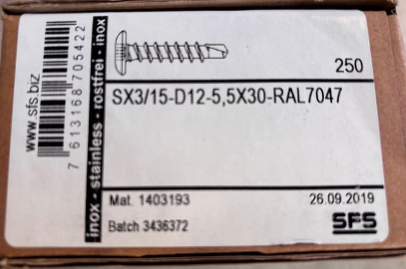 RRP $319, Silbonit SS Screws - (RAL-7047) Pietra 011 (Light Grey) SX3/15-D12-5.5X30 (Box of 250)