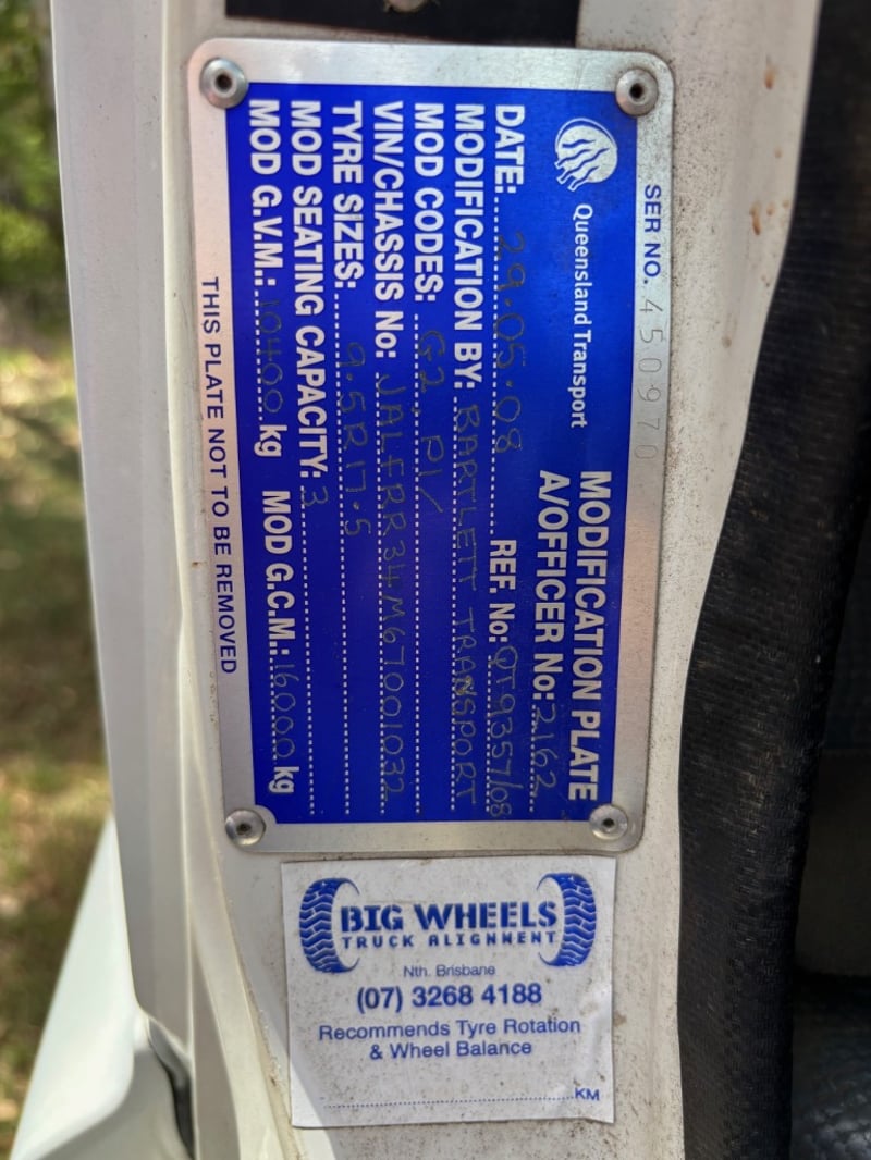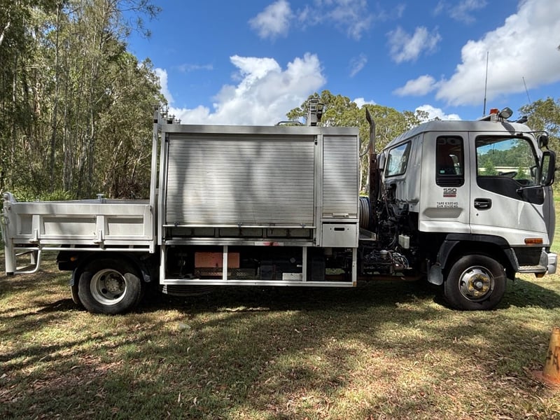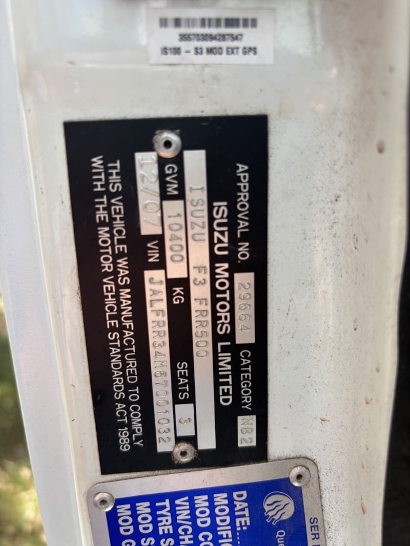 2007 Isuzu FRR 500 Service Truck Year: 2007 Make: Isuzu Model: FRR 500 Body: Service Truck Odometer: 233,540 Kilometres Transmission: 6 speed manual Engine: 6 cylinder turbo diesel Configuration: 4x2 Notes/Extras: Hydraulic drop down platform for service work station, tow bar, roller shutters on both sides, vice, reverse camera, storage space behind cab, isolators GVM – 10,400 kilograms. TARE – 6,320 kilograms VIN: JALFRR34M67001032 Engine No: 6HK1458607 (as per ppsr)