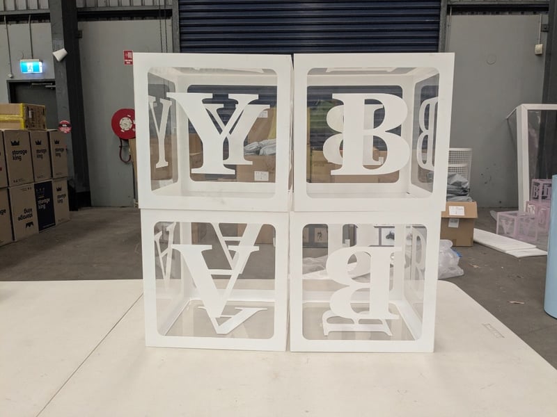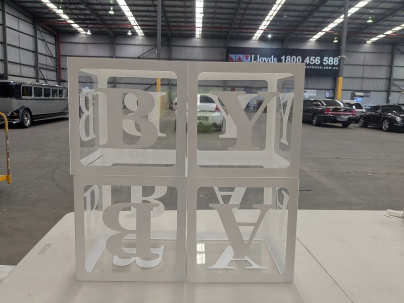 RRP $280 Acrylic ‘BABY’ Boxes, Prop, Party Hire White
