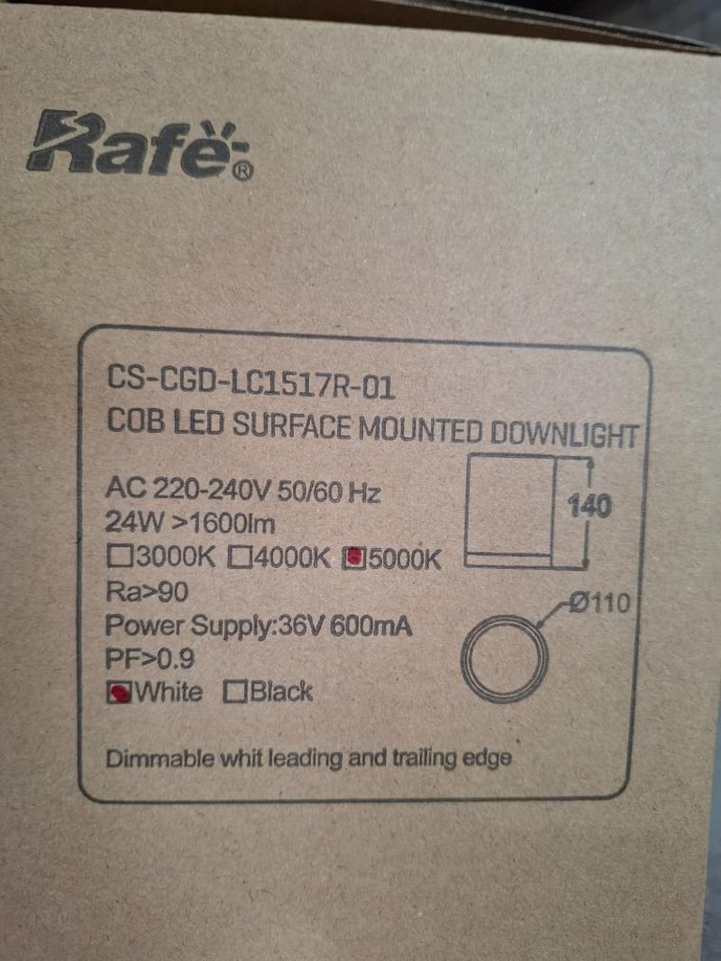 RRP $1932 Combined, Rafe 24W Surface Mount Downlight 5000K IP65 WHQTY: 12pcsMODEL: CS-CGD-LC1517R-01-5000K-WHPRODUCT DIMENSIONS: Ø110mm X H140mm