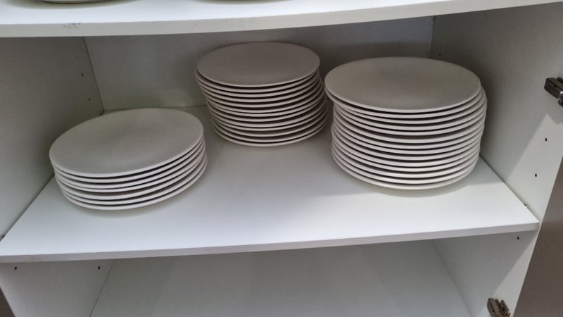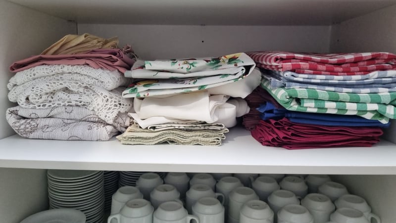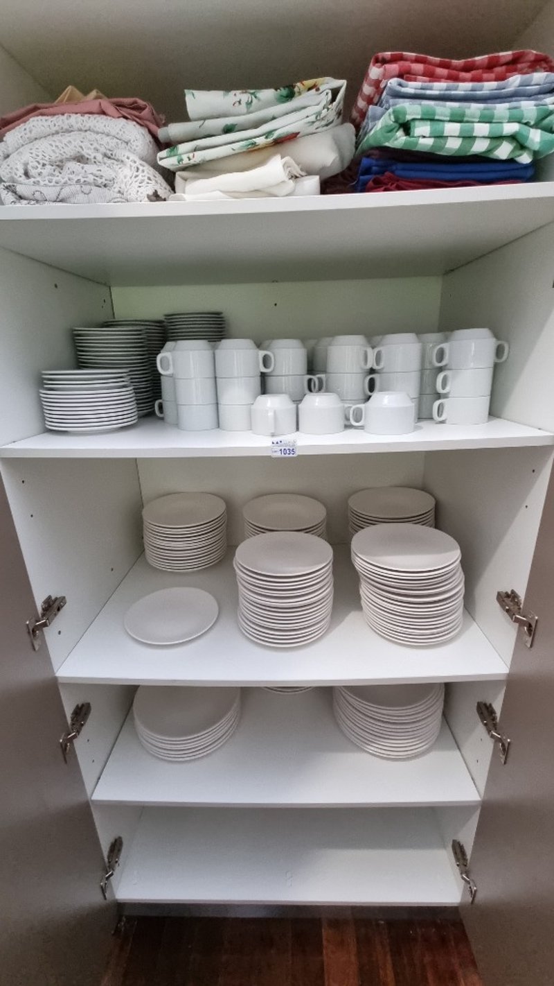 Contents of Cabinet, Includes Bulk Quantity of Mugs, Bowls, Plates Table ClothsSold As Lot