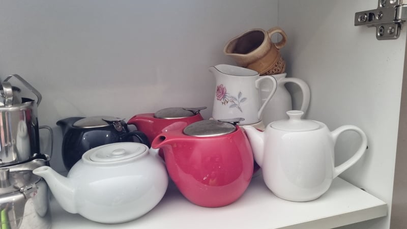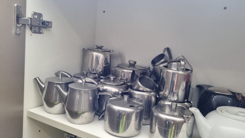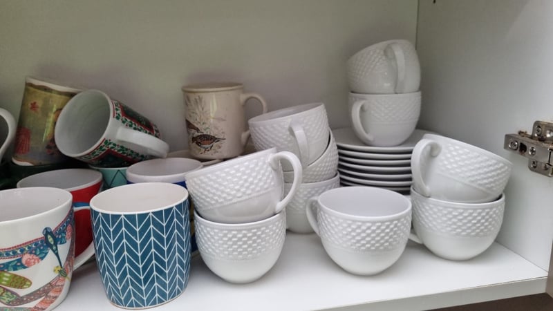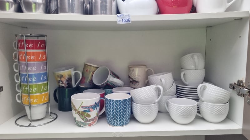 Contents Of Cabinet Includes Stainless Steel Mil/Cream Jugs, Cups, Mugs and MoreSold as Lot