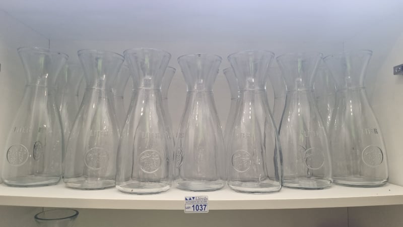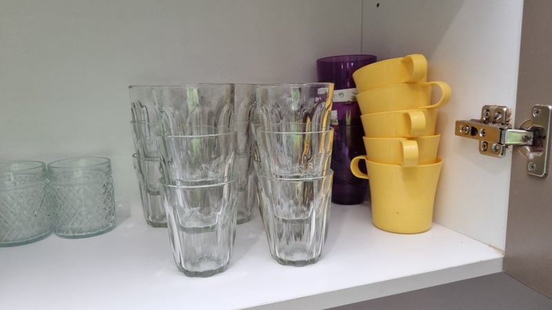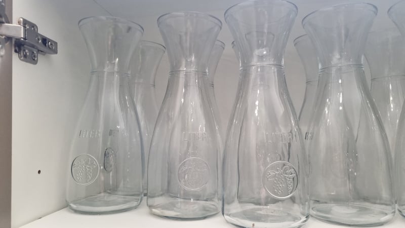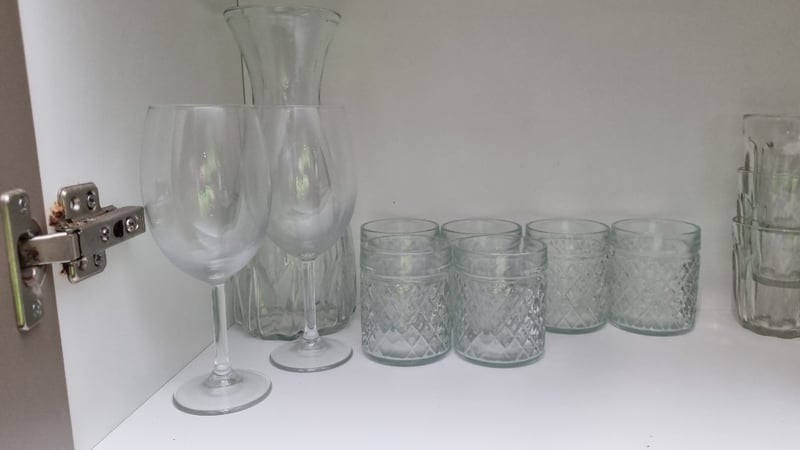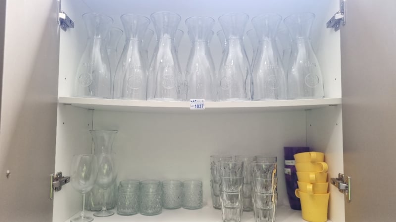 Contents of Cabinet, Water Carafes, Glass Cups and More