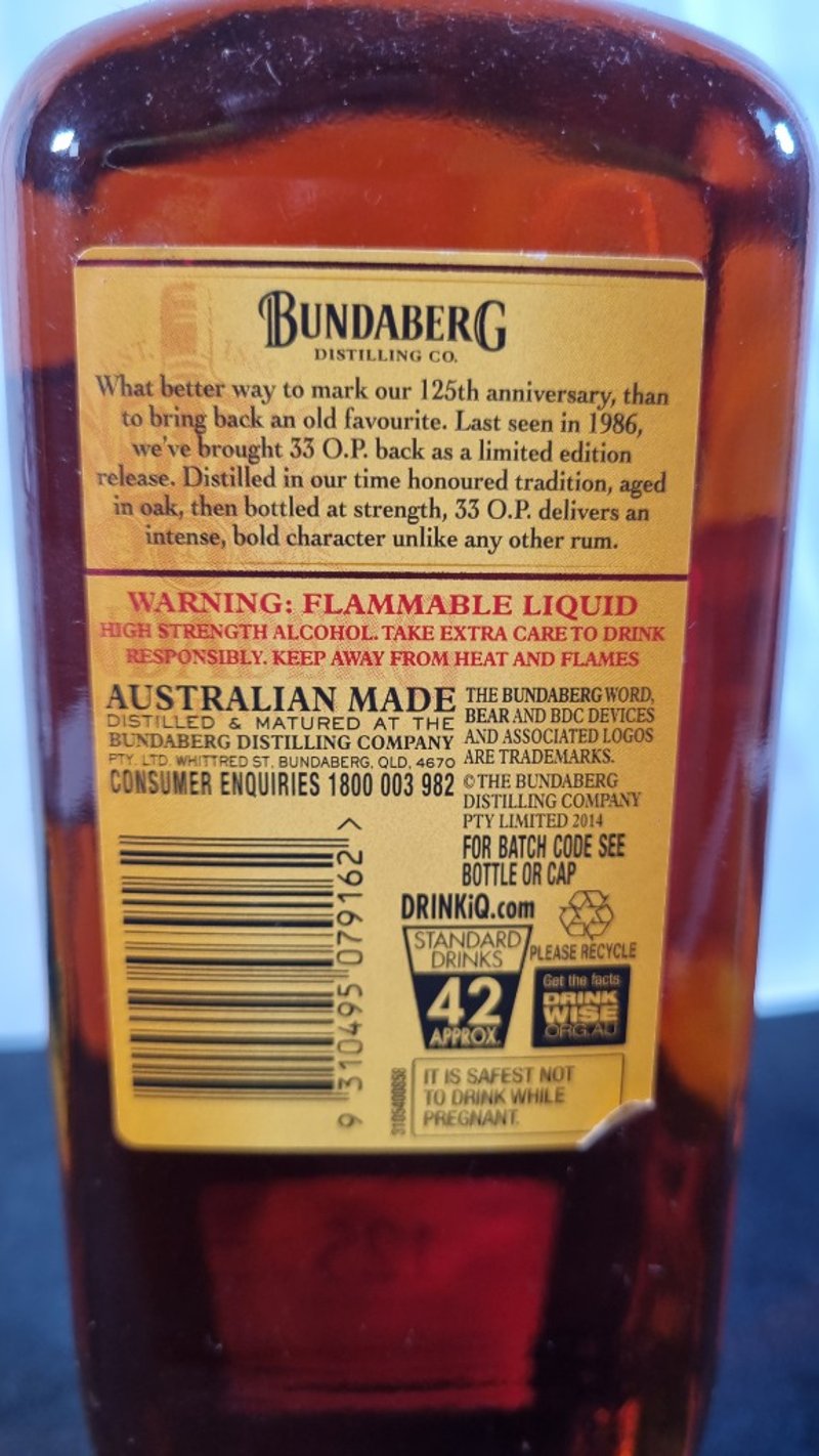 Bundaberg Rum, 125th 1888-2013 Anniversary 33 OP Overproof Rum, Limited Edition 2013