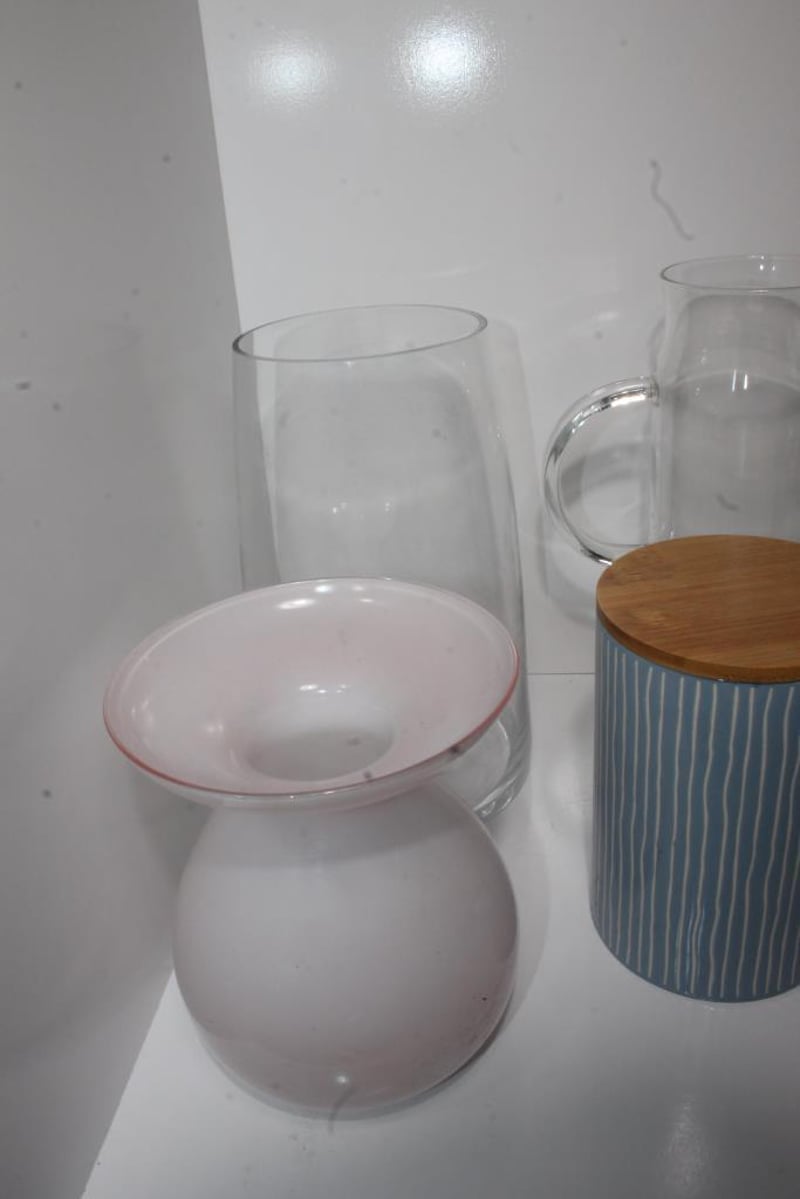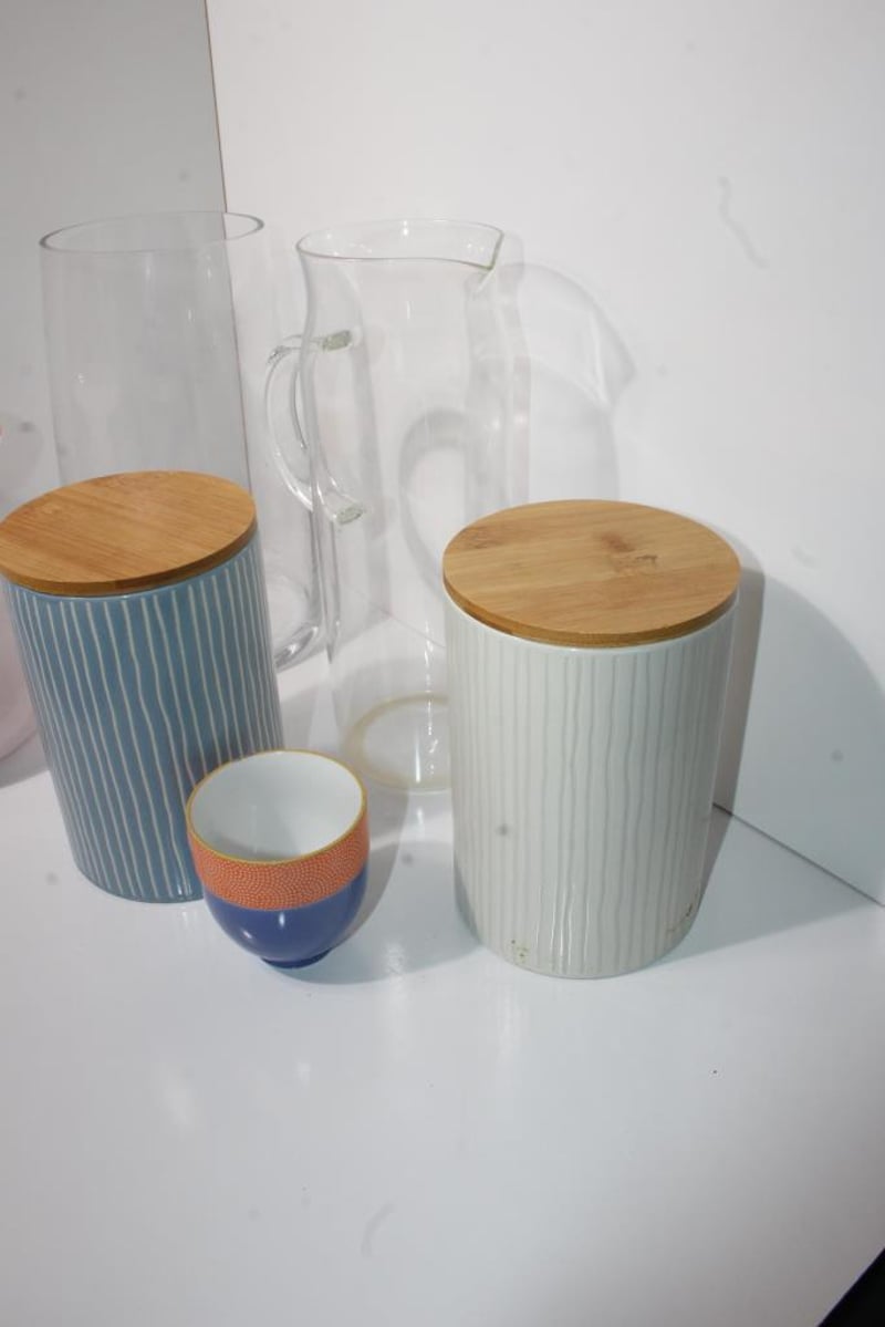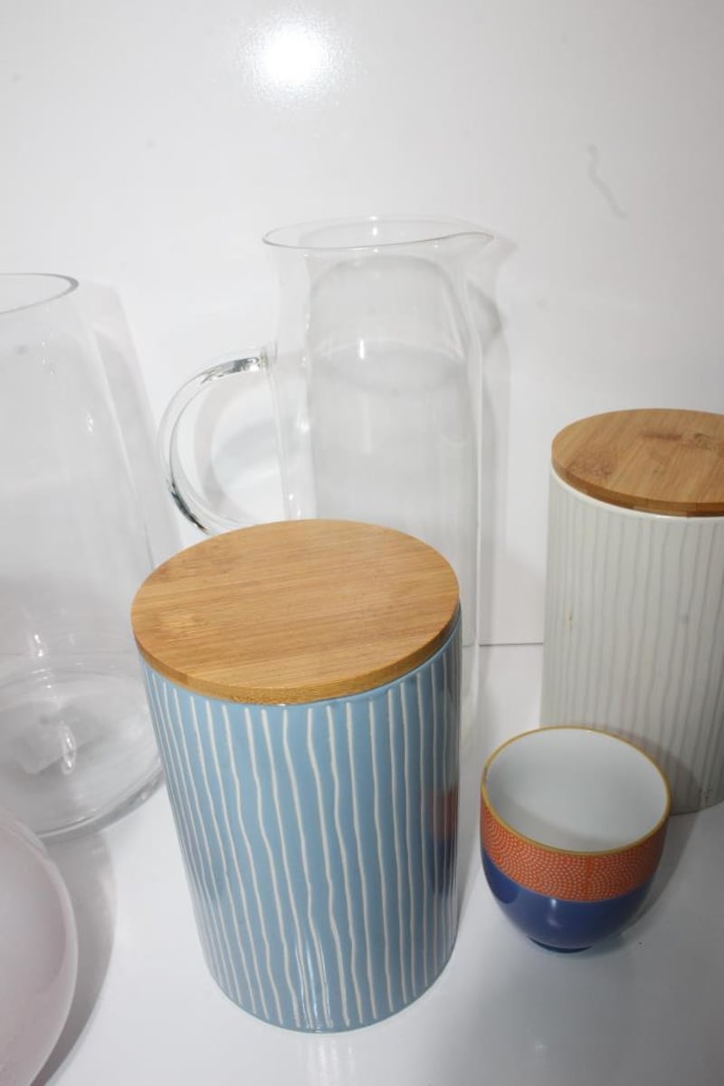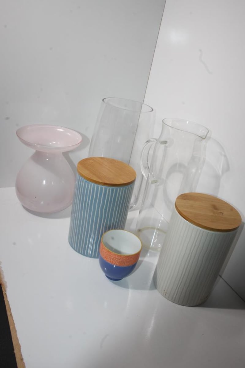 Includes Image Glassware torpedo vase (label CSB1225 visible) and Coles stoneware canister (bamboo lid); mixed colours and styles, all items untested, condition as pictured.