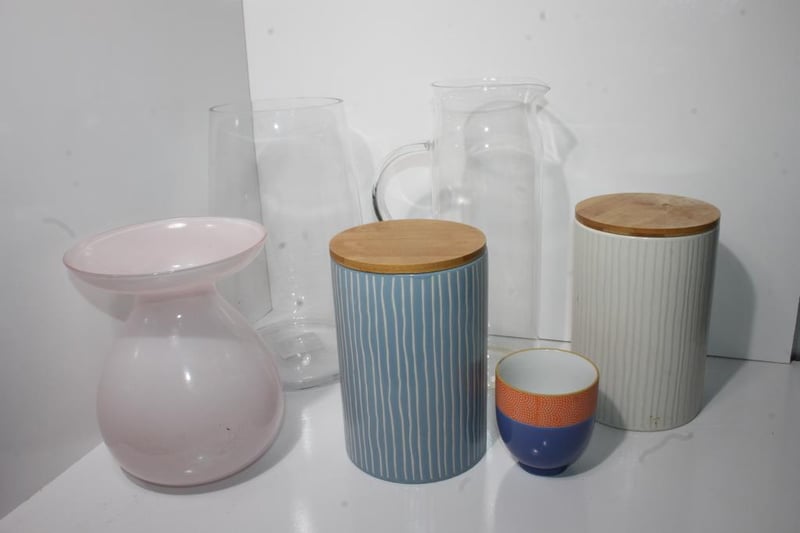 Mixed Glassware & Canisters Lot – Vases, Jug, Storage Canisters, Cup