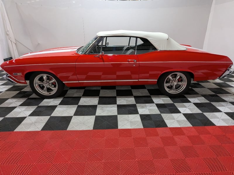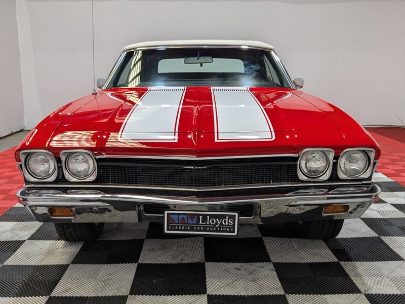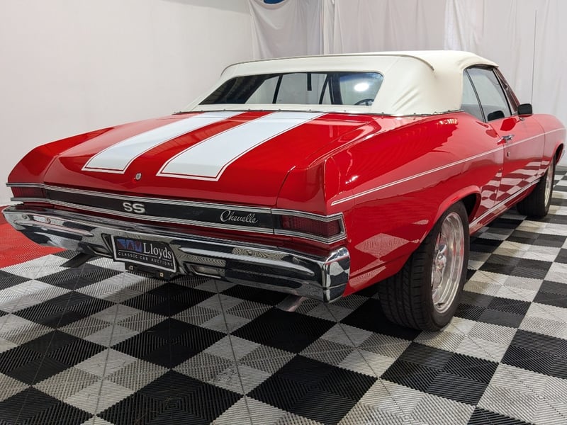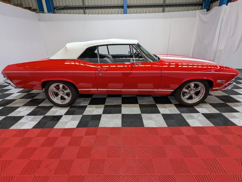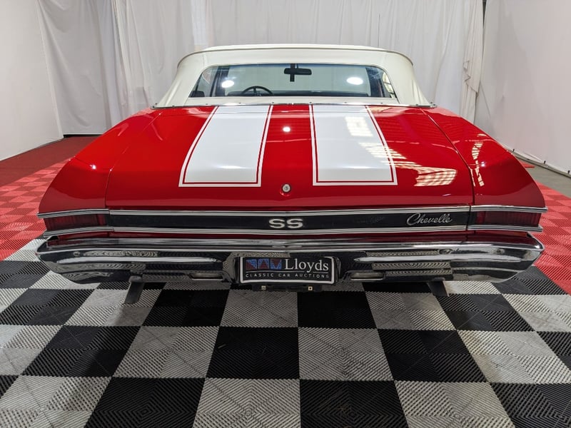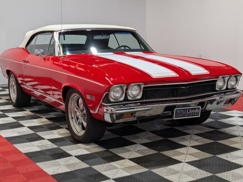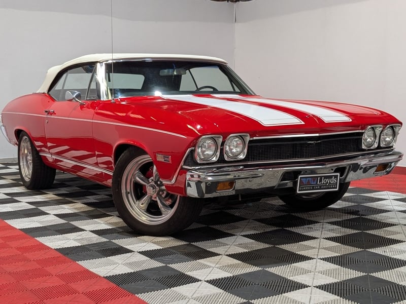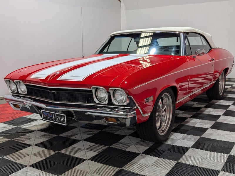 1968 Chevrolet Chevelle SS Malibu two‑door convertible finished in Red. Rear‑wheel drive configuration powered by a 396ci (6.5‑litre) V8 petrol engine paired with a 3‑speed manual transmission. Odometer indicating 10,406 miles. Seating for five occupants.