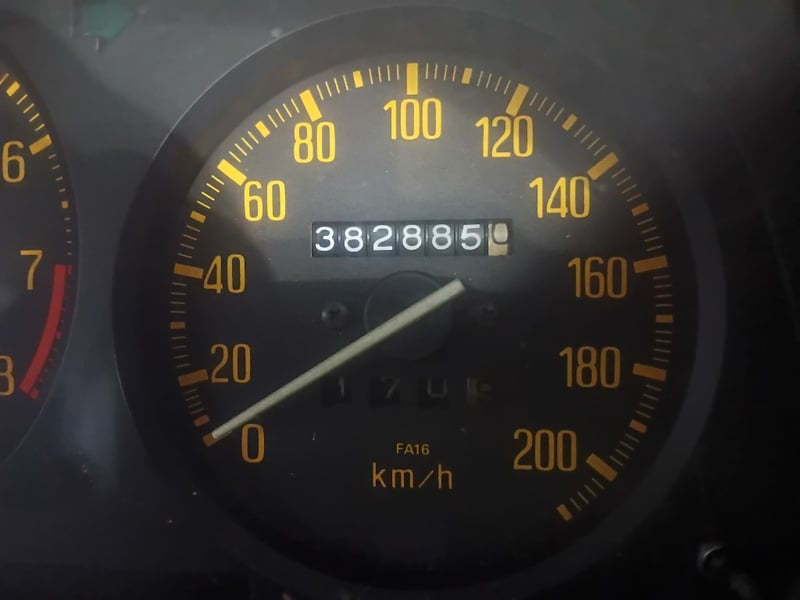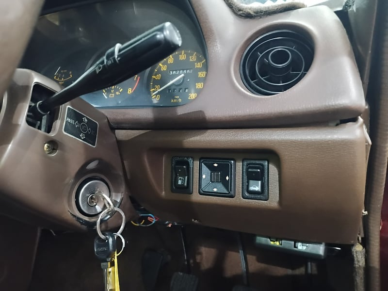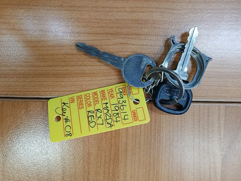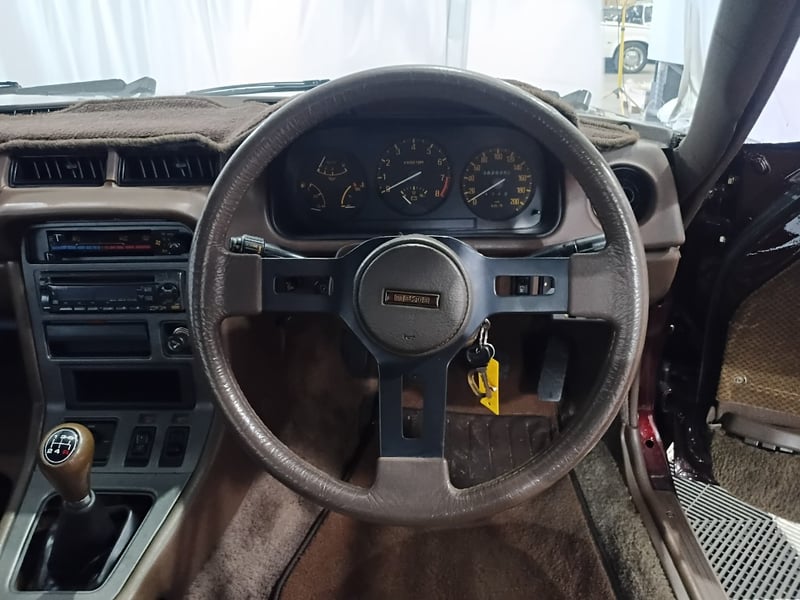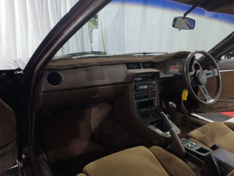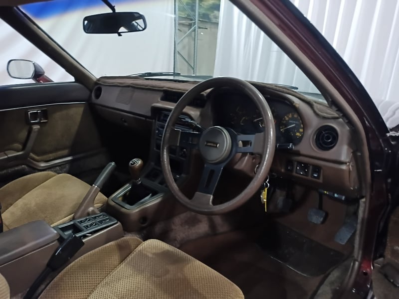 1984 Mazda RX‑7 two‑door coupe finished in Brandy Wine. Rear‑wheel drive configuration powered by a petrol engine paired with a 5‑speed manual transmission. Odometer indicating 382,885 kilometres. Seating for four occupants.