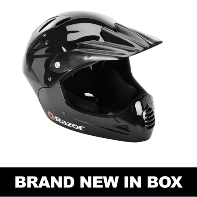 RRP $95 Razor Full Face Helmet - Gloss BlackFITS YOUNG RIDERSFits head sizes 55CM to 58CM; Recommended for ages 8 to 14 yearsCOMFORTABLE PROTECTIONFull circumference headband padding is comfortable and secureCOOLING VENTS17 top and side vents allows airflow and helps riders keep a cool head on hot daysADJUTABLE VISORAdjustable visor helps keep sun out of their eyes; Large eye port provides great visibility while providing room for goggles #e2mob