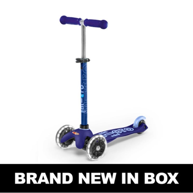 RRP $190 Micro Mini Deluxe 3 Wheel Scooter with LED Lights - BlueMini Micro Deluxe LED 3 Wheel Scooter – Light-Up Fun for Ages 2–5Make every scoot an adventure with the Mini Micro Deluxe LED Scooter – the award-winning preschooler scooter with light-up wheels. Designed for kids aged 2–5, this scooter combines safety, style, and excitement in one lightweight, durable design.Why Kids (and Parents) Love ItLED Light-Up Wheels: Motion-powered wheels that glow as your child rides—no batteries required.Develops Balance & Coordination: Intuitive lean-to-steer action helps preschoolers learn naturally.Safe & Stable Design: 3 wheels, low-to-the-ground deck, and extra-grip silicone surface for added stability.Grows with Your Child: Adjustable handlebar (49–68cm) ensures years of use.Durable Build: Anodised T-bar protects against rust, non-marking wheels keep floors and paths scuff-free.Convenient & Compact: Removable T-bar makes storage and transport easy.Key BenefitsPerfectly sized for little riders, the Mini Micro Deluxe LED is lightweight (just 1.95kg), making it easy for children to carry and handle. Its light-up wheels not only add excitement but also boost visibility for safer scooting adventures.SpecificationsAge Range: 2–5 yearsMax Load: 50kgWeight: 1.95kgWheel Size: 120mm (front) / 80mm (rear)Handlebar Height: 49–68cm (adjustable)Deck Width: 11cmDeck Length: 51cmFoot Area Length: 30cmGround Clearance: 3cm #e2mob