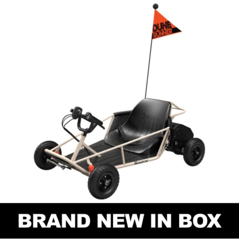 RRP $1299 Razor Ground Force Dune RunnerConquer the Backyard in Rugged Style with the Razor Dune RunnerGet ready for off-road adventures like never before with the Razor Dune Runner – a rugged, all-terrain electric go-kart built for young thrill-seekers aged 8 and up. Engineered for backyard fun, the Dune Runner pairs a powerful 350W motor with oversized rubber tyres and a steel frame to deliver a fast, stable, and exciting ride on dirt, grass, and pavement.Powered by a reliable 24V (2x 12V/7Ah) lead-acid battery system, this compact yet durable kart reaches speeds of up to 16 km/h and offers a run time of up to 40 minutes per charge. The thumb throttle and responsive rear disc brake provide simple control, while the rear suspension ensures a smoother ride across rougher terrain.Comfort and safety are built into every detail—from the bucket seat with integrated seatbelt to the wide molded plastic deck, ensuring maximum grip and protection. The Dune Runner includes unique features like nylon wheel hubs, fabric side panels, and a bold orange safety flag for extra visibility.Whether you're tearing it up in the yard or zipping down dirt trails, the Dune Runner is ready for action. #e2mob