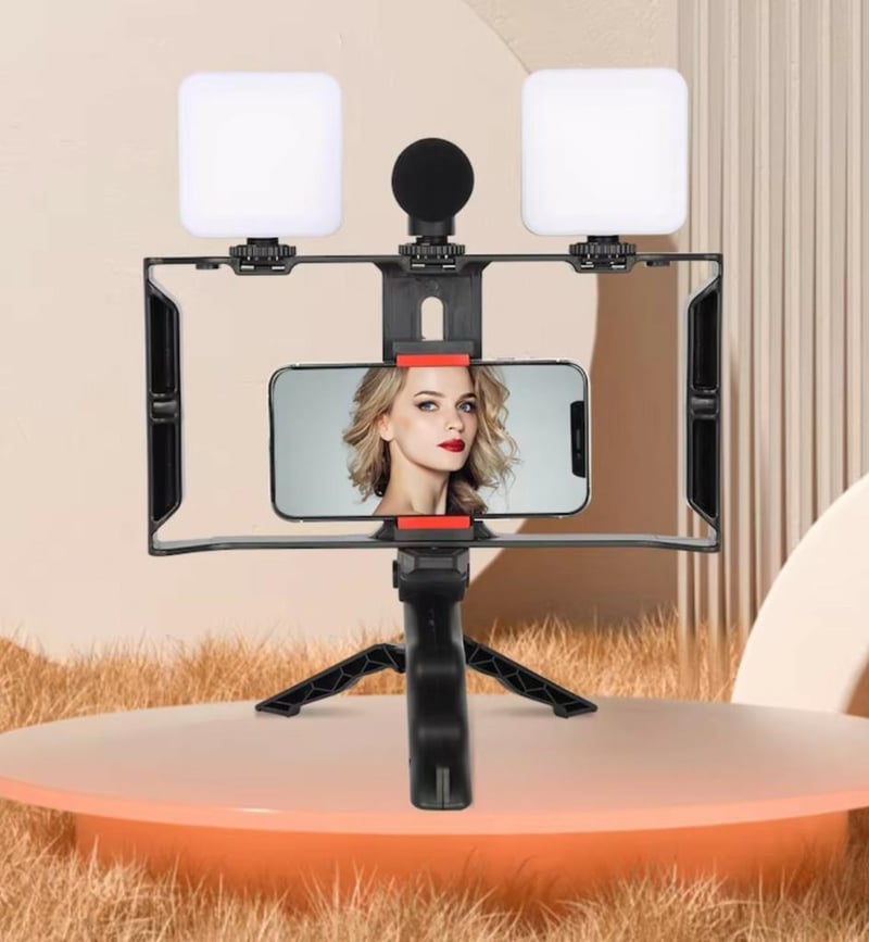 Selfie Stick Vlog Tripod Home Blog Camera Kit for Vlogging All in One Outdoor Kit Dual 7w LED Lights and Microphone Phone Clip and Tripod Stand Great Content Creation Set-Up Support mobile phone size 7-9.3cm width Stand Height Approx 25cm (7 x AAA Batteries included) (BRAND NEW IN BOX)
