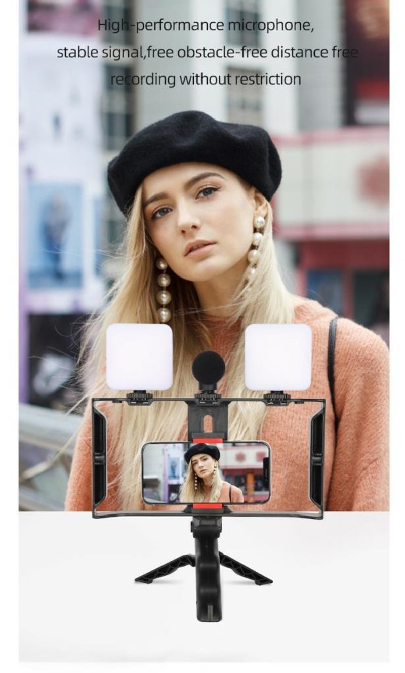 Selfie Stick Vlog Tripod Home Blog Camera Kit for Vlogging All in One Outdoor Kit Dual 7w LED Lights and Microphone Phone Clip and Tripod Stand Great Content Creation Set-Up Support mobile phone size 7-9.3cm width Stand Height Approx 25cm (7 x AAA Batteries included) (BRAND NEW IN BOX)
