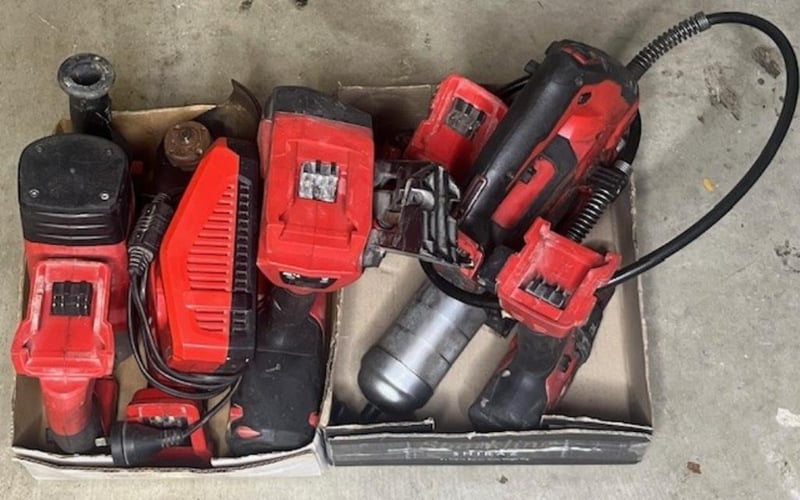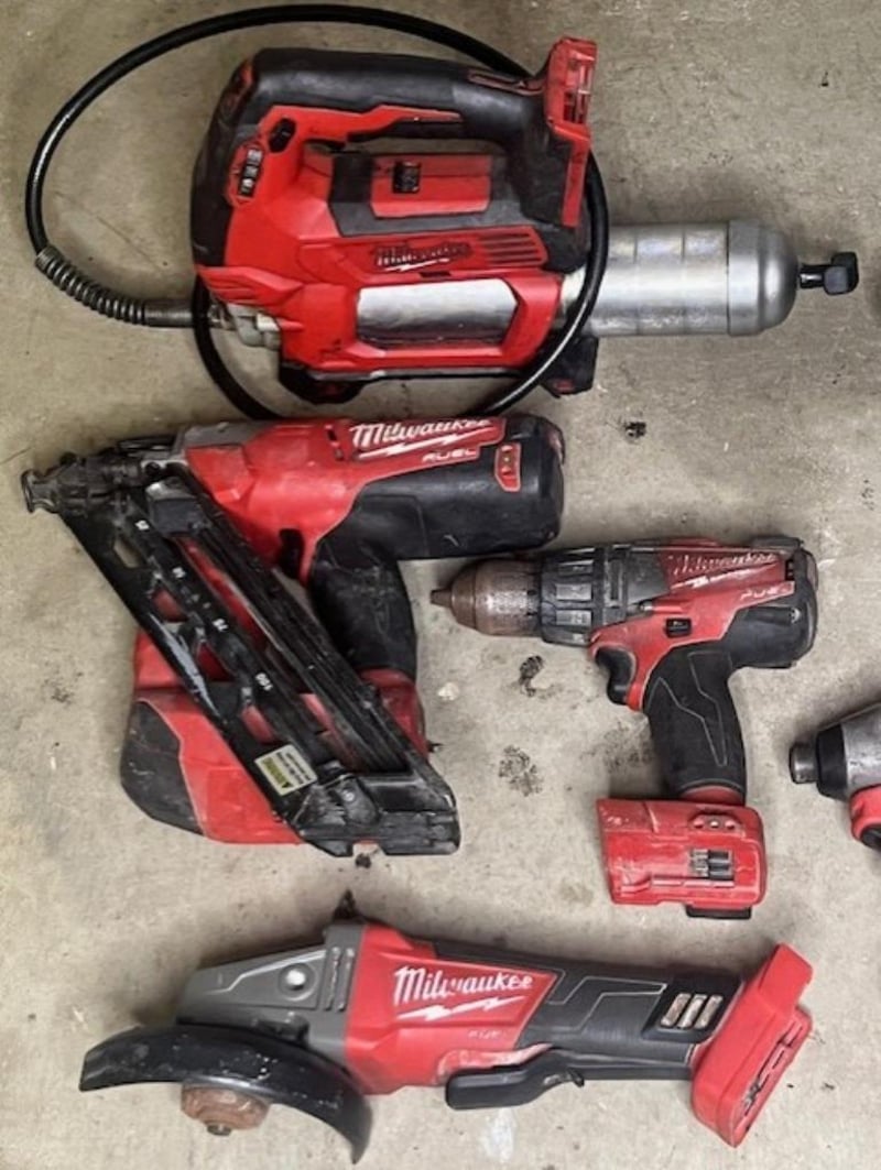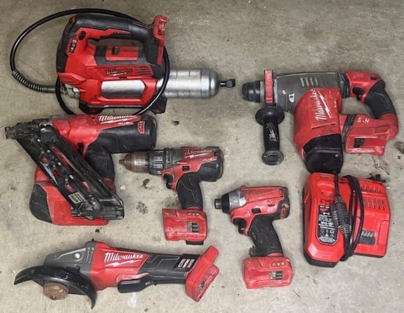 Cordless Milwaukee 18V tools. 1 x M18 CN15GA nailer, 1 x M18 FPD hammer drill, 1 x M18 CHP rotary hammer drill, 1 x M18 GG grease gun, 1 x M18 CID impact driver, 1 x CAG125XPD angle grinder, 1 x M12-18FC charger. Skins only, no batteries. Condition: Not working, untested, for parts or repair.