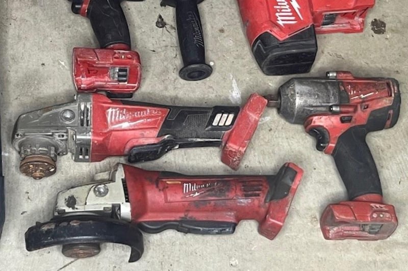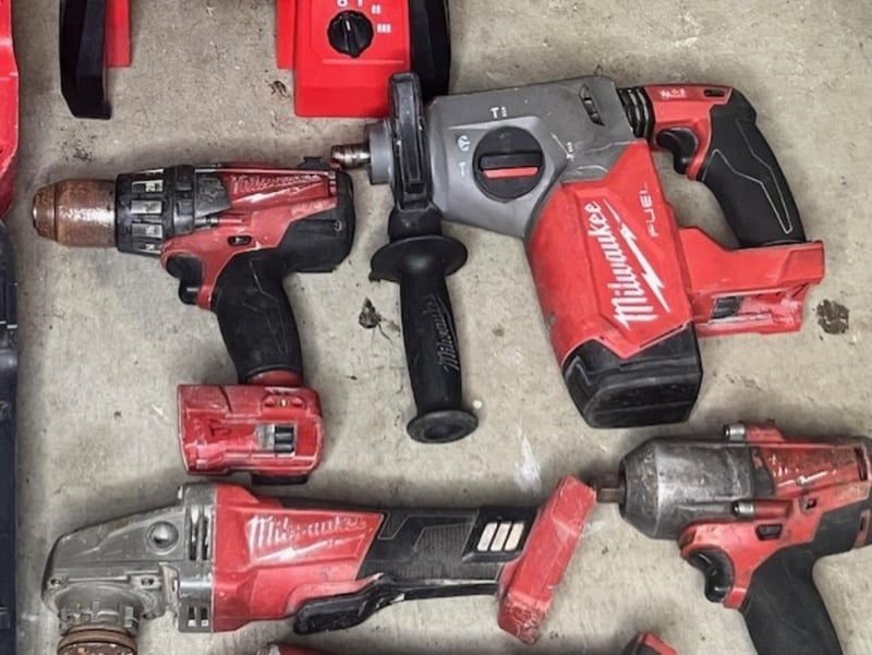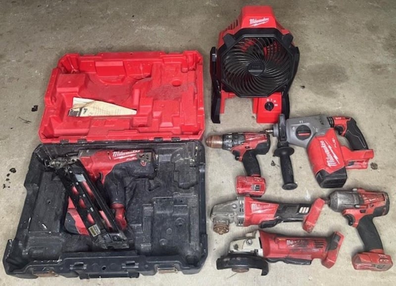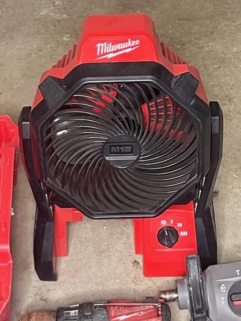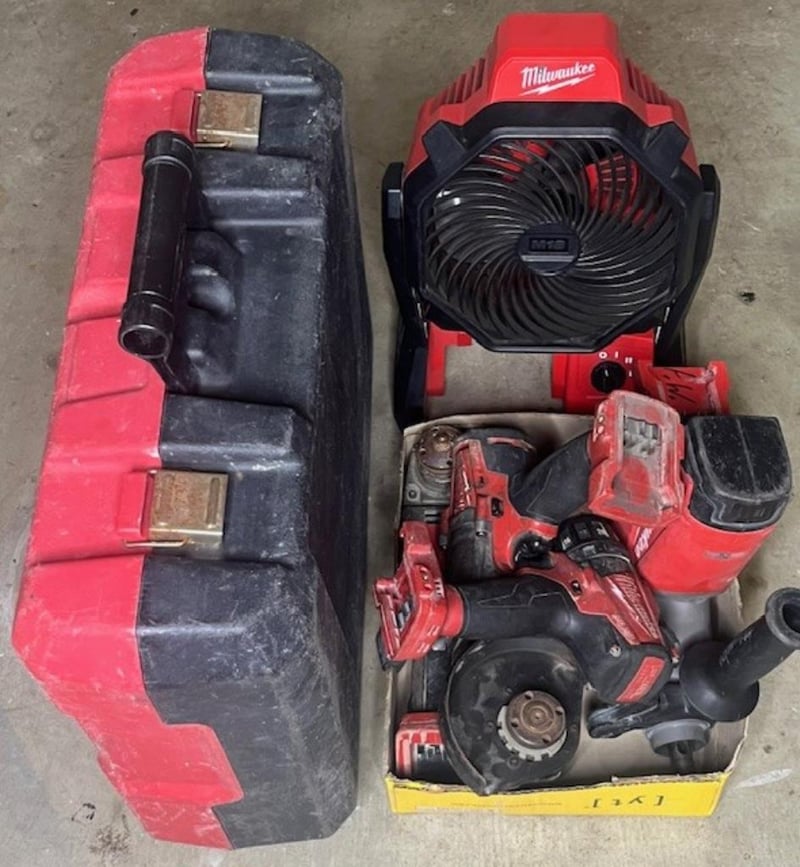Cordless Milwaukee 18V tools. 1 x M18 CN15GA nailer, 1 x M18 AF work fan, 1 x M18 FH rotary hammer drill, 1 x M18 hammer drill, 1 x M18 impact wrench, 1 x CAG125XPD angle grinder, 1 x HD18 AG125 angle grinder. Skins only, no batteries. Condition: Not working, untested, for parts or repair.