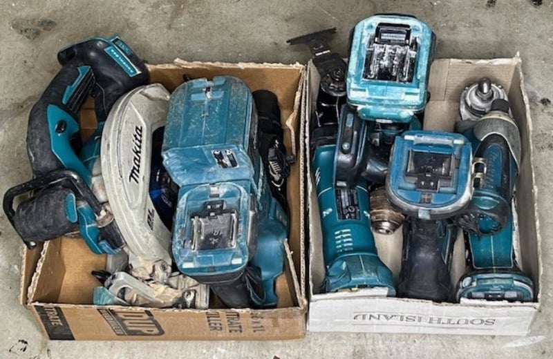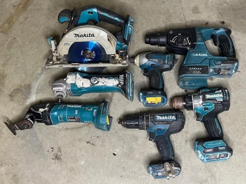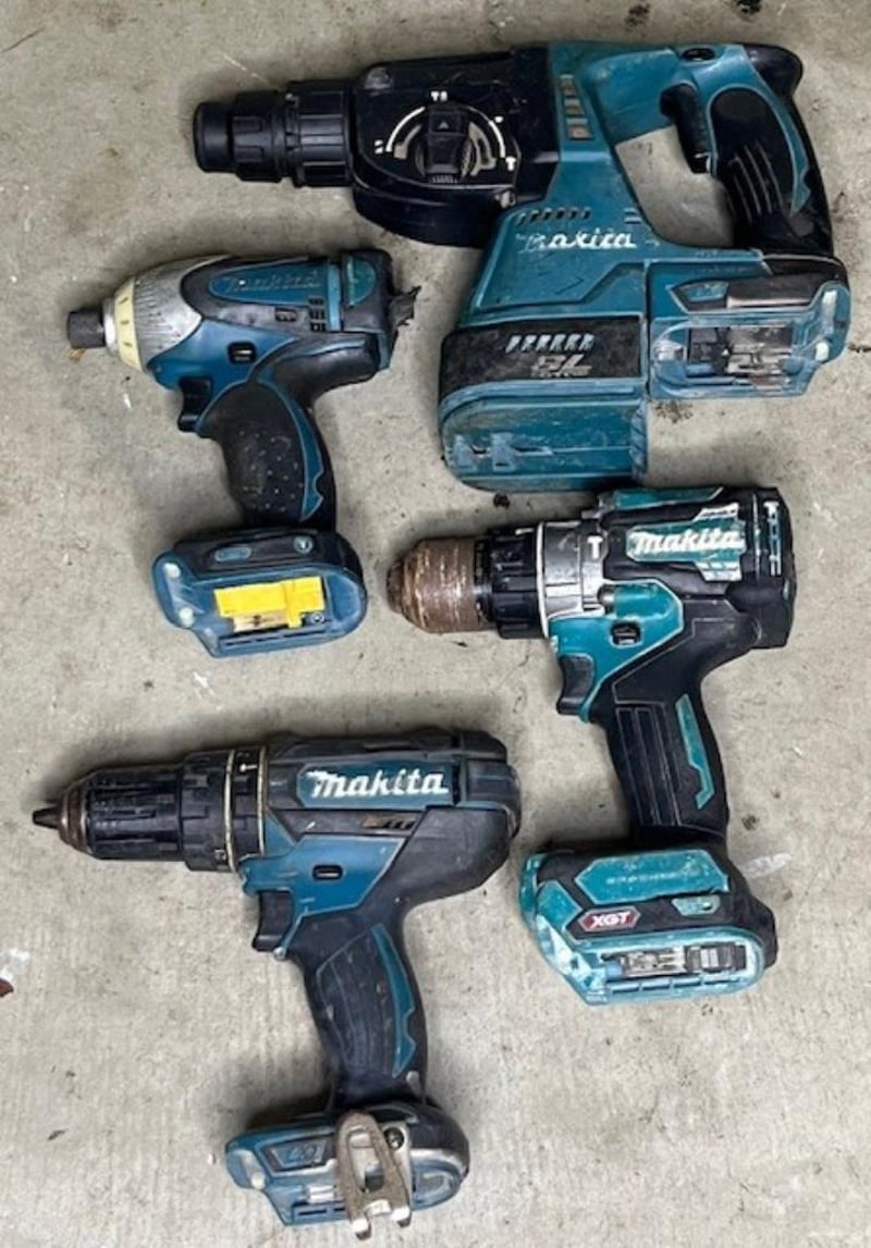 Cordless Makita 18V tools. 1 x DHS680 circular saw, 1 x DHR242 rotary hammer drill, 1 x DHP482 hammer drill, 1 x impact driver, 1 x DTM50 multifunction tool, 1 x DGA452 angle grinder, 1 x HP001G hammer drill (36V). Skins only, no batteries. Condition: Not working, untested, for parts or repair.