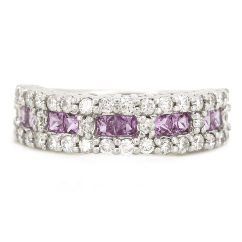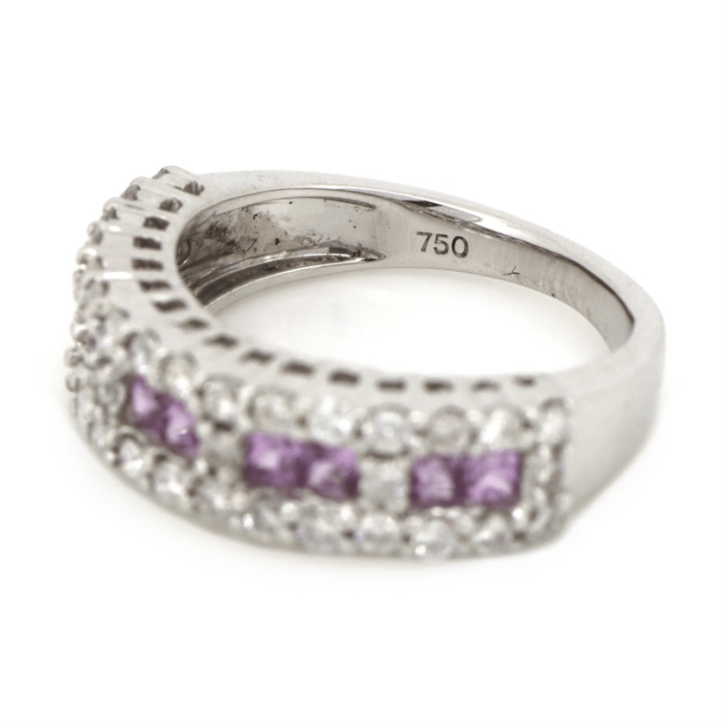18K WHITE GOLD, PINK SAPPHIRE AND DIAMOND, BAND RING.