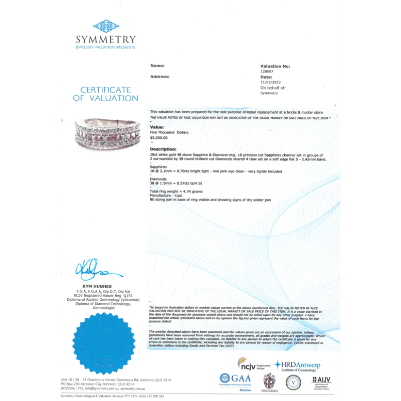 The Design Features, 10 Princess Cut, Pink, Sapphires (0.70Ct Tsw, Eye Clean Clarity), Channel Set. Embellishing The Design Are, 38 Round Brilliant Cut, Diamonds (0.57Ct Tdw, G-H Colour, Si Clarity), Bead Set. Ring Size K. Condition: Pre-Owned.