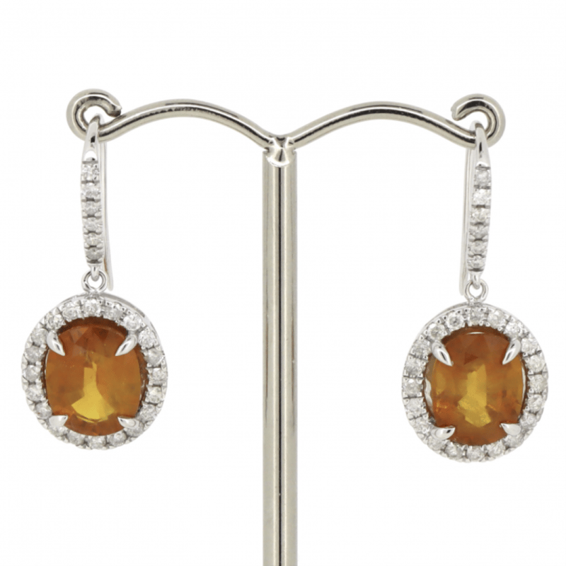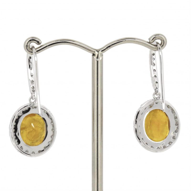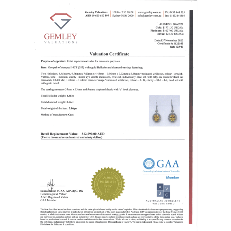 14K WHITE GOLD, HELIODOR AND DIAMOND, HALO EARRINGS. The Centres Feature, 2 Oval Cut, Medium Greyish-Yellow, Heliodors (4.45Ct Tsw, Minor Eye Visible Inclusions), 4 Claw Set. Surrounding The Centres In Halos And Decorating The Drops Are, 56 Round Brilliant Cut, Diamonds (0.64Ct Tdw, J-K Colour, Si2-I2 Clarity), Bead Set With Millegrain Detail. The Earrings Have Shepherd Hooks With 'C' Hook Closures. Valuations Provided by an Independent Third-Party Professional Not Directly Associated With Lloyds Auctions at AUD $$12,790.00This valuation has been conducted by an independent third-party professional. The valuation amount is an assessment by the issuing valuer and does not reflect the auction value of the item. Any inquiries regarding the valuation should be directed to the issuing valuer (refer to contact details on the certificate), as Lloyds Auctions has no affiliation or influence over the valuation, the valuer, or the stated amount. Condition: Good - Refer Images 0645961+1406