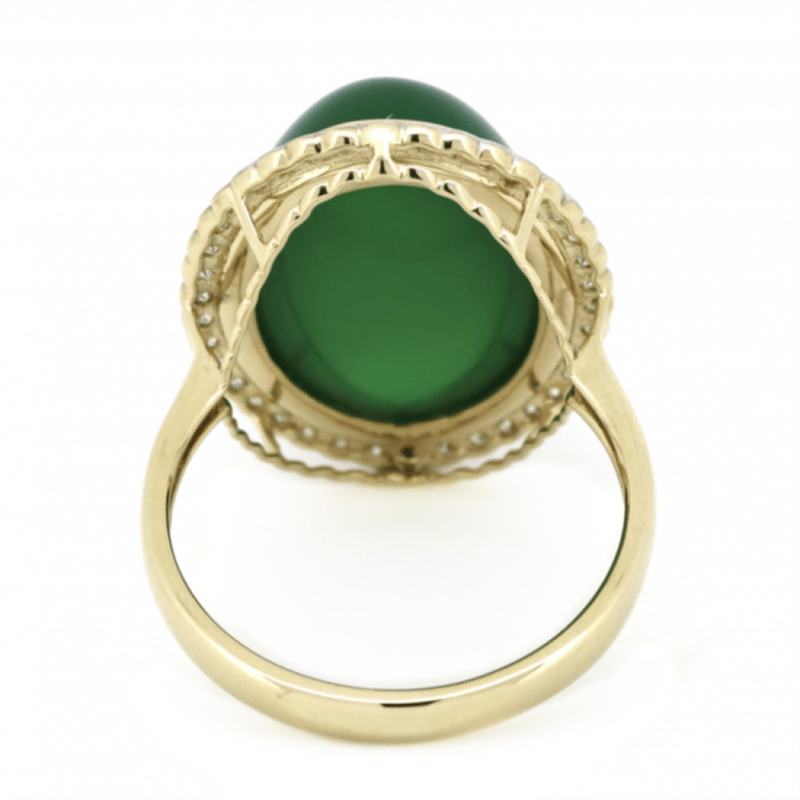 The Centre Features, One Oval Cabochon Cut, Even-Moderate Green, Chrysoprase (13.65Ct, Slightly Included, Enhanced), Bezel Set. Surrounding The Centre In A Halo Are, 38 Round Brilliant Cut, Diamonds (0.36Ct Tdw, H-K Colour, P2+ Clarity), Bezel Set. Ring Size O 1/2.