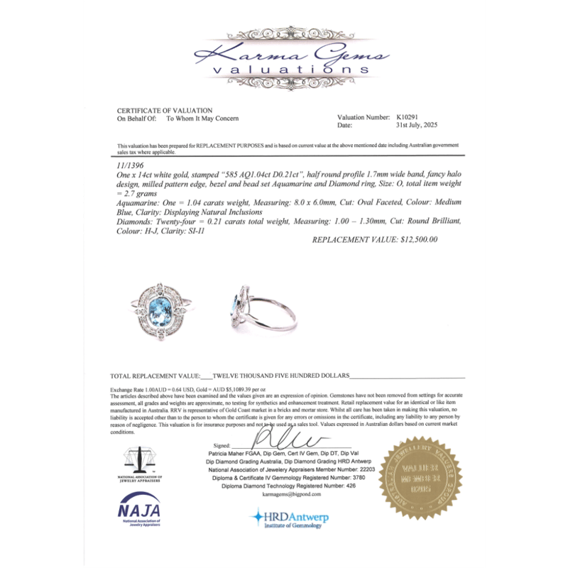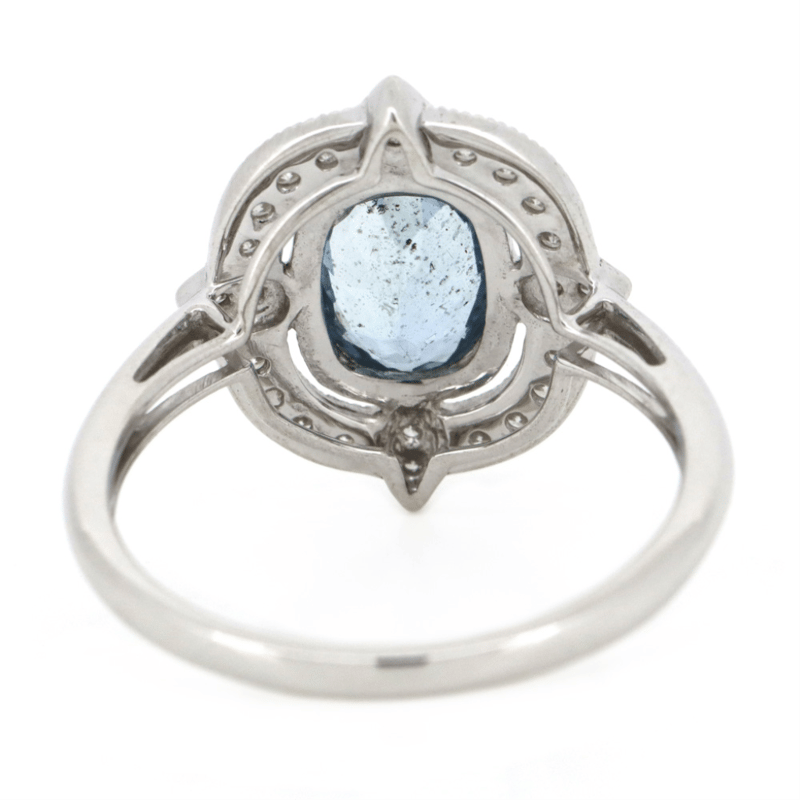 The Centre Features, One Oval Faceted Cut, Medium Blue, Aquamarine (1.04Ct, Natural Inclusions), Bezel Set. Surrounded By, 24 Round Brilliant Cut, Diamonds (0.21Ct Tdw, H-J Colour, Si-I1 Clarity), Bead Set. Ring Size O.