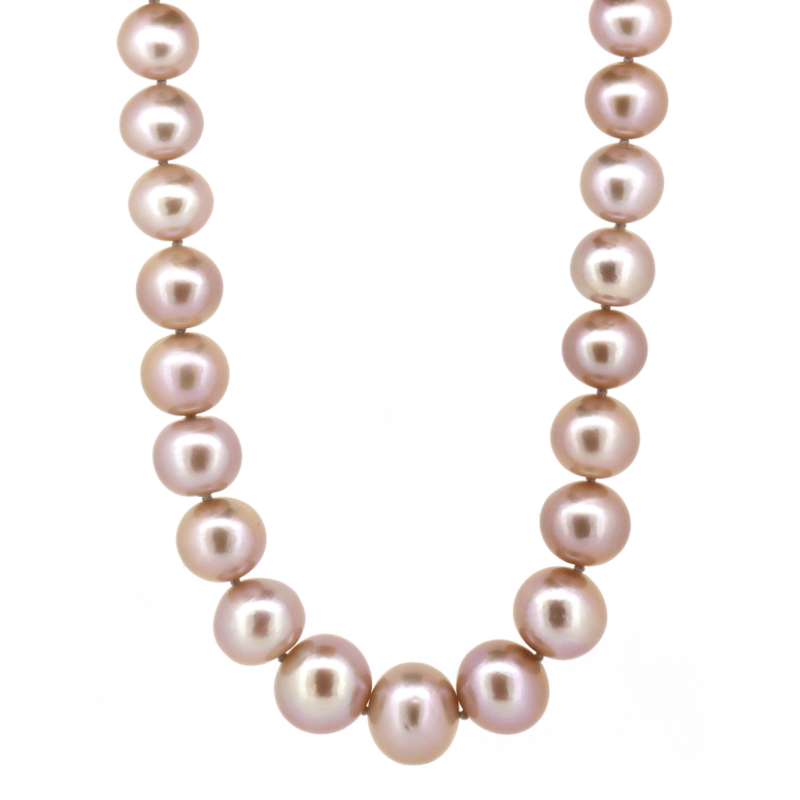 The Necklace Features, 40 Near Round, Pink/Mauve With Purple, Silver And Gold Overtones, Cultured Freshwater Pearls (9.9Mm-13.7Mm Size, Good Lustre, Growth Blemishes). Embellishing The 14K Rose Gold Filigree Ball Clasp Are, 4 Round Brilliant Cut, Diamonds (0.04Ct Tdw, J-K Colour, Si-I2 Clarity), Bead Set. Necklace Length Is 45Cm.