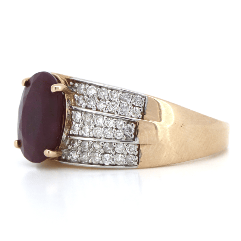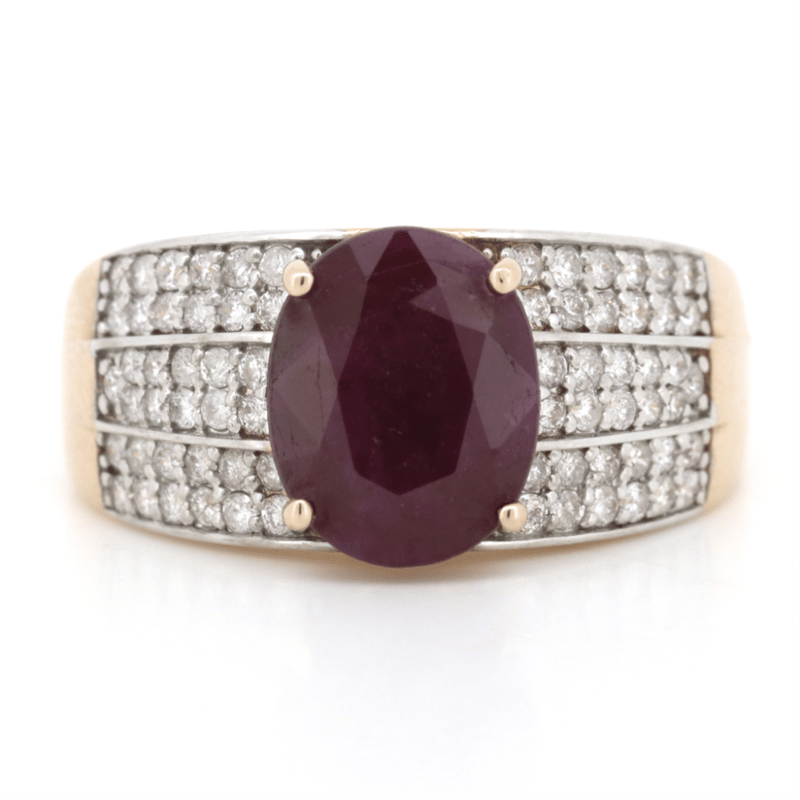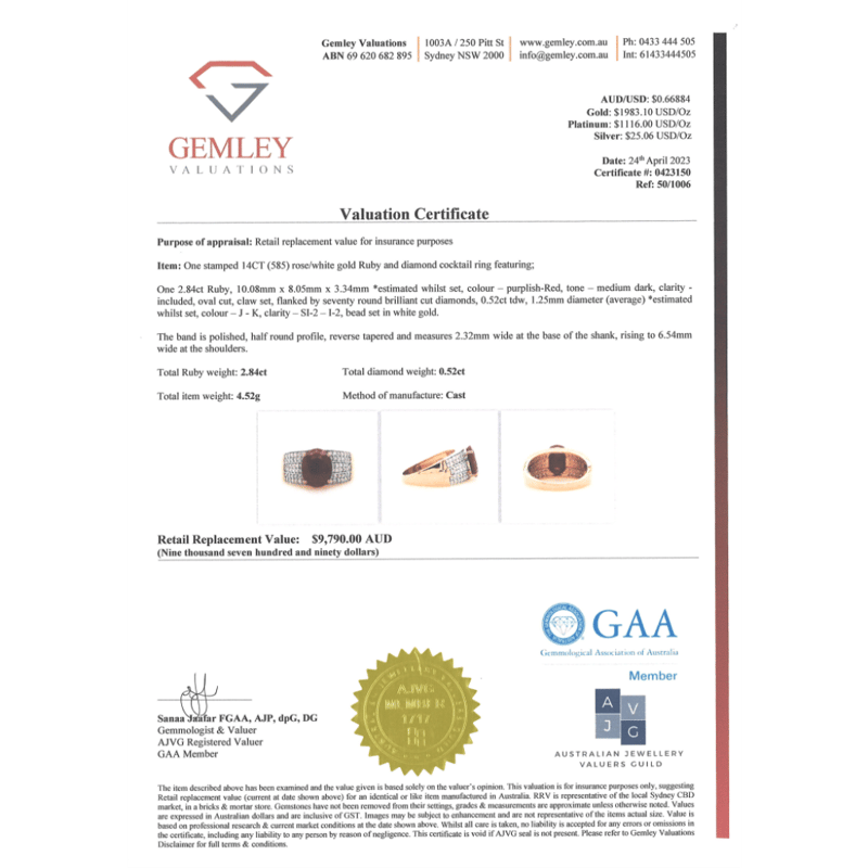 14K ROSE GOLD, RUBY AND DIAMOND, TRIPLE ROW BAND RING. The Centre Features, One Oval Cut, Medium Dark Red, Ruby (2.84Ct, Included), 4 Claw Set. Flanking The Centre In A Triple Row Are, 70 Round Brilliant Cut, Diamonds (0.52Ct Tdw, J-K Colour, Si2-I2 Clarity), Bead Set In White Gold. Ring Size O. Valuations Provided by an Independent Third-Party Professional Not Directly Associated With Lloyds Auctions at AUD $$9,790.00This valuation has been conducted by an independent third-party professional. The valuation amount is an assessment by the issuing valuer and does not reflect the auction value of the item. Any inquiries regarding the valuation should be directed to the issuing valuer (refer to contact details on the certificate), as Lloyds Auctions has no affiliation or influence over the valuation, the valuer, or the stated amount. Condition: Good - Refer Images 0645961+1418
