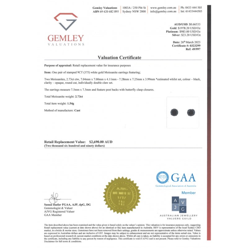 The Design Features, 2 Round Cut, Black, Moissanites (2.73Ct Tsw, Opaque), Double Claw Set. The Earrings Have Post Backs With 9K White Gold Butterfly Clasps.