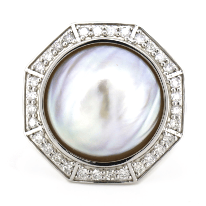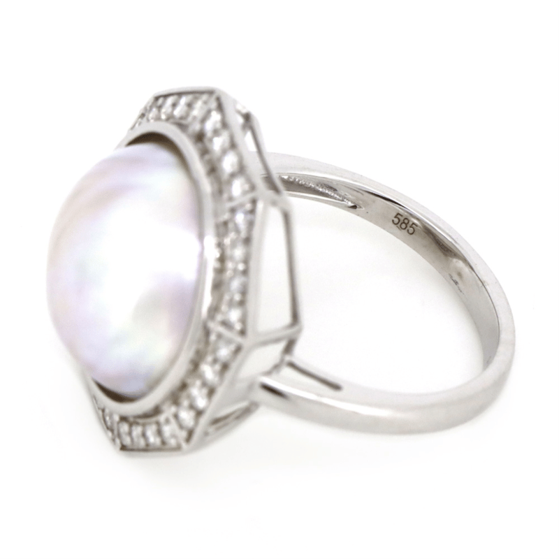 14K WHITE GOLD, WHITE CULTURED SOUTH SEA MABE PEARL AND DIAMOND, DRESS RING.