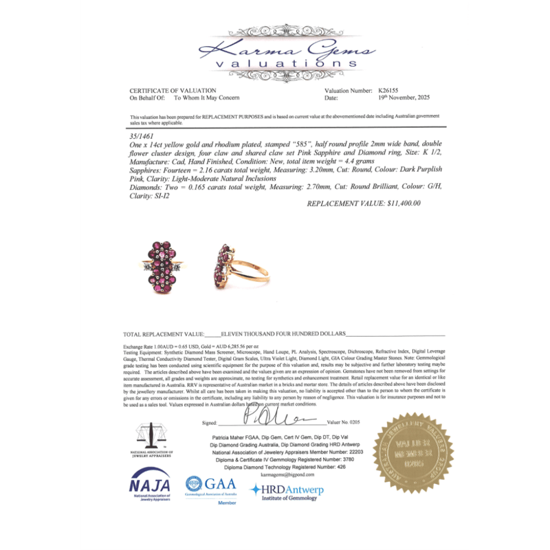 The Design Features, 14 Round Cut, Dark Purplish-Pink, Sapphires (2.16Ct Tsw, Light-Moderate Inclusions), Bead Set In Two Flower Designs. Accompanied By, 2 Round Brilliant Cut, Diamonds (0.165Ct Tdw, G-H Colour, Si-I2 Clarity), 4 Claw Set. Ring Size K 1/2.